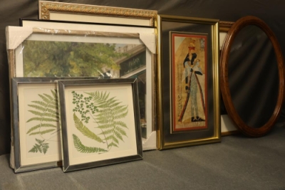 Artwork including 7 prints and 2 mirrors. Pieces include unsigned print of a palm tree, "Quaubcojolli Terenty" print by J Combs(?), Flintstones print by Animation Art, and print of "Main St., Bridgehampton" by Allison Burrell (signature in artwork). Rectangular mirror with golden frame and print of Queen Nefertari of Egypt measures approximately 28.5 inches long and 16.5 inches wide. Oval mirror with wooden frame measures approximately 29.5 inches long and 21.5 inches wide. Artwork piece sizes range from approximately 29.5 inches long by 25.5 inches wide to approximately 15.5 inches long by 15.5 inches wide. Pickup only.