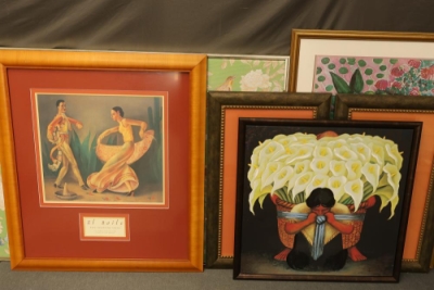 6 Pieces of Framed Artwork Featuring Works by Matisse, Rivera, and Lantz. Includes a framed poster of 'Goldfish'?? by Henri Matisse, three framed prints from the La Fonda Collection by Paul Valentine Lantz titled 'El Baile,'?? 'El Querido,'?? and 'La Querida,'?? a framed canvas print of 'The Flower Carrier'?? by Diego Rivera with mixed media, and a framed canvas print in the style of Grace Mitchell's 'Jade Garden Birds and Flowers.'?? Pieces measure from approximately 46.5 inches long by 34.25 inches wide to approximately 26.25 inches long by 26.25 inches long. Pickup only.