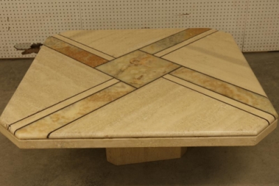 Maurice Villency Style Onyx and Travertine Marble Patterned Coffee Table. Measures approximately 17.75 inches high, 42.75 inches wide, and 42.75 inches deep. Features a pinwheel style design with a combination of onyx and travertine marble patterns. Pickup only.