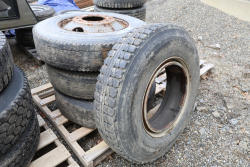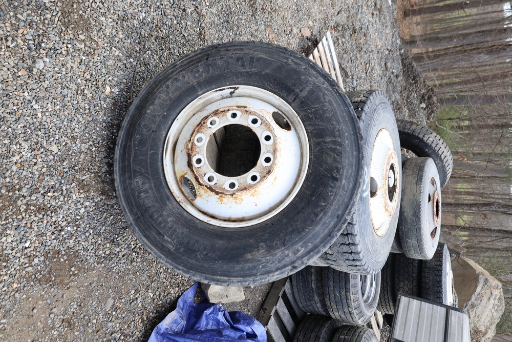Four truck tires on steel rims, including Continental HDR2, size 11R22.5..