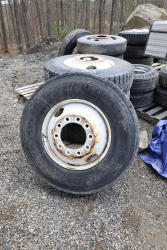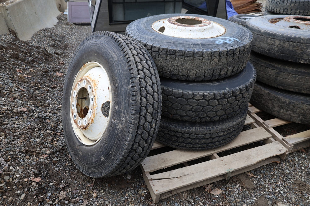 Four truck tires on steel rims, including Double Coin, size 11R22.5.
