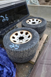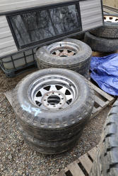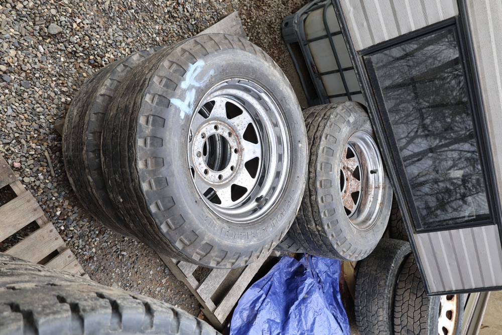 Four truck tires on steel rims, including Hercules Herculite, size 10-16.5LT.