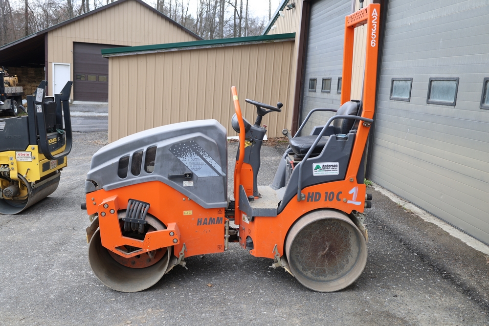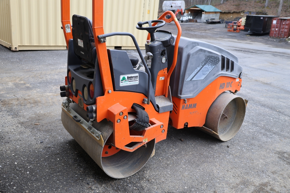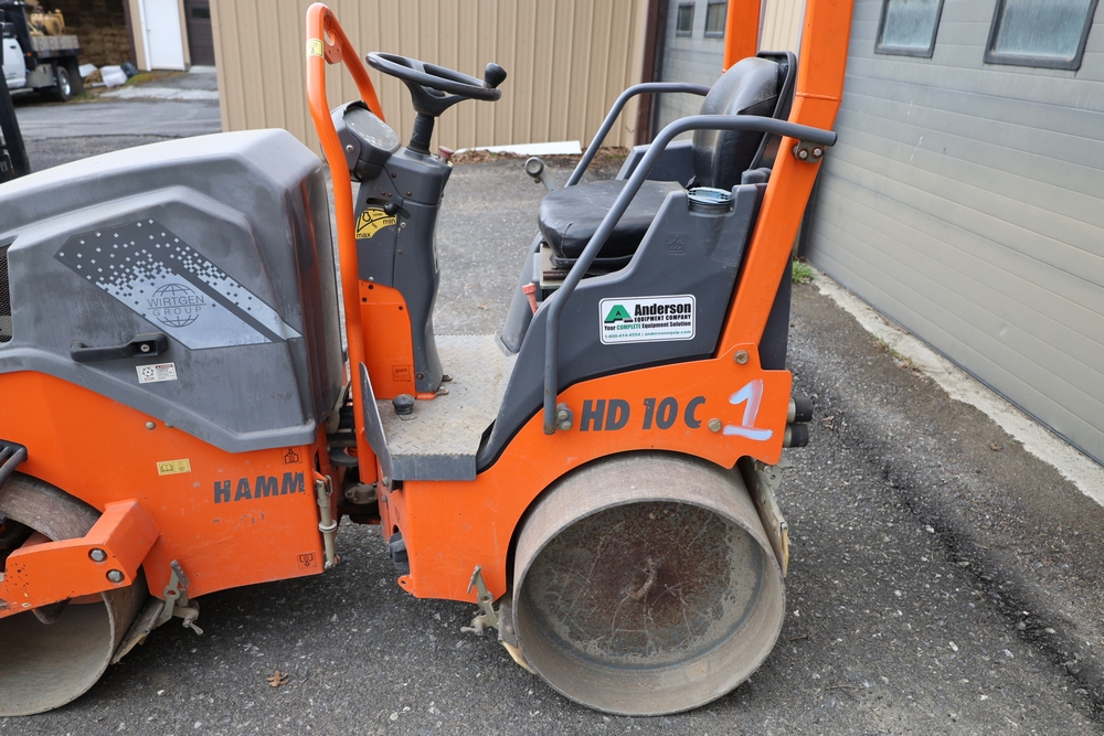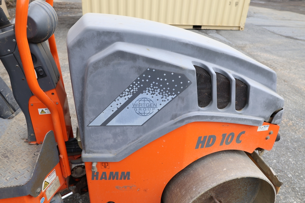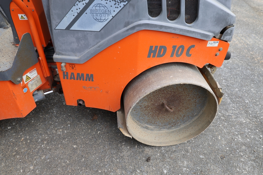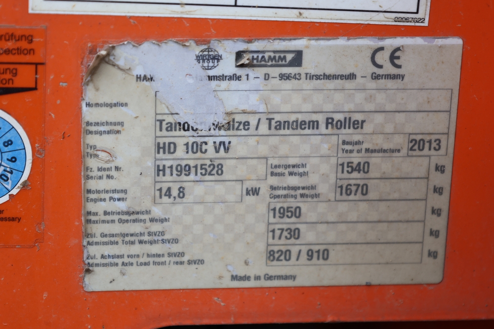 2013 Hamm HD 10 C tandem roller, model HD 10 C W, serial number H1991528, Kubota D1005 ET05 engine, open operator station with seat and control panel, dual steel drums. Runs and operates.