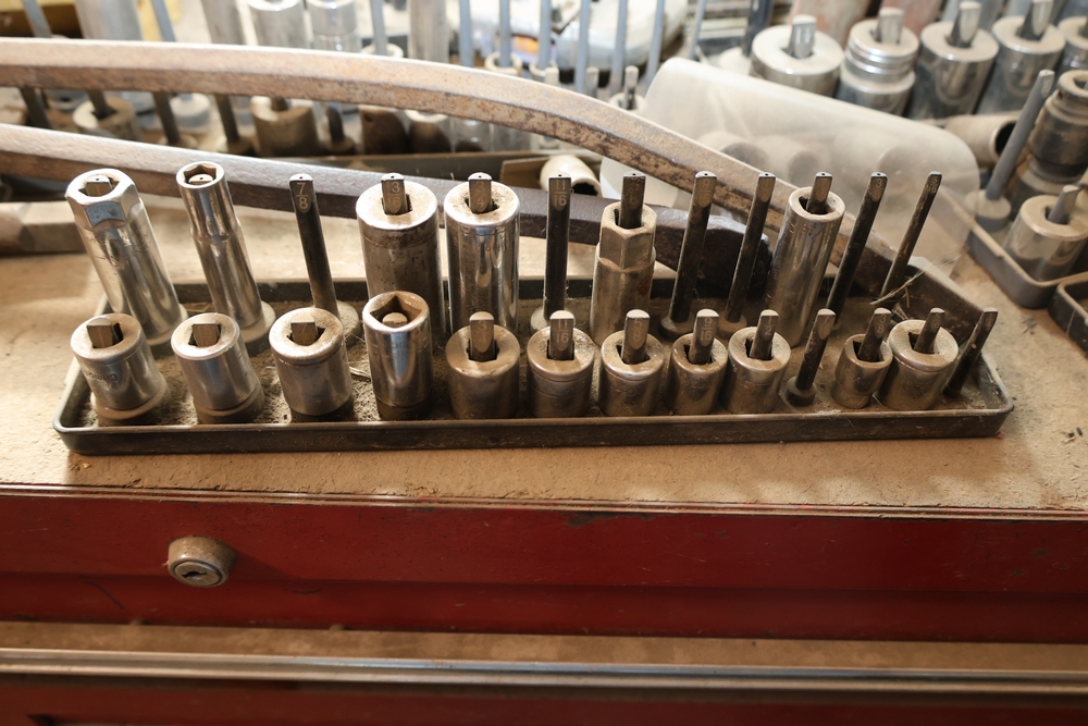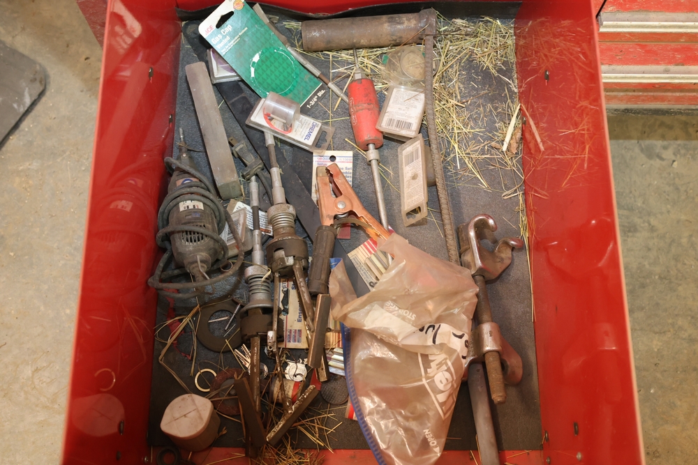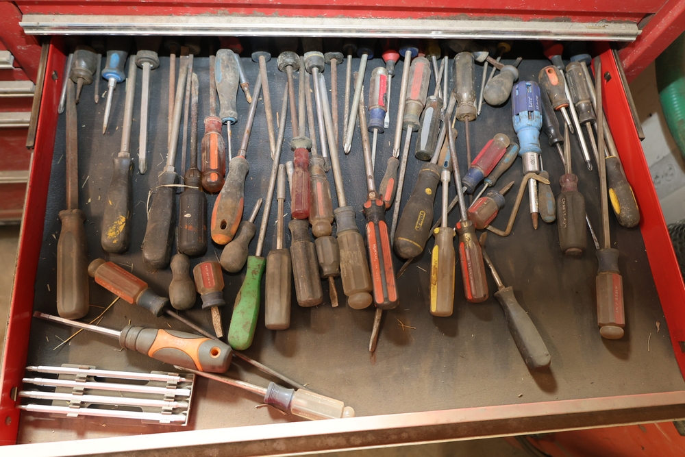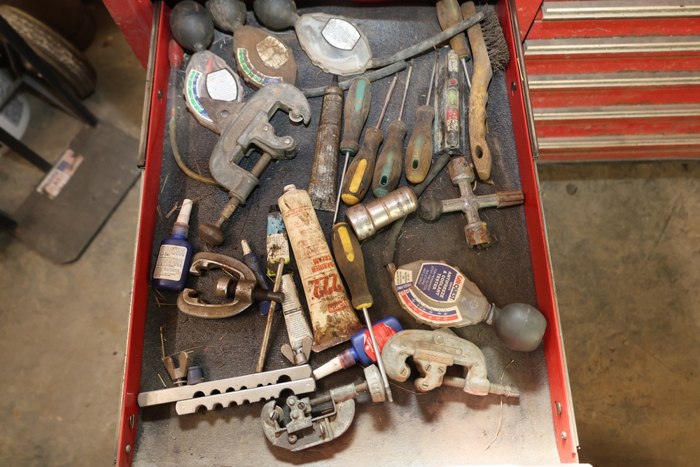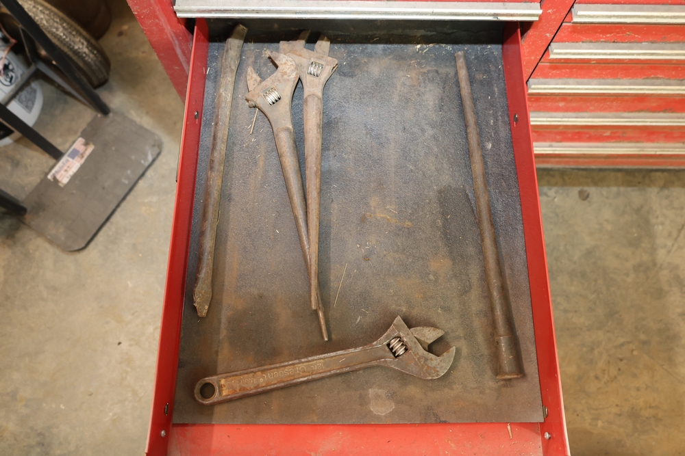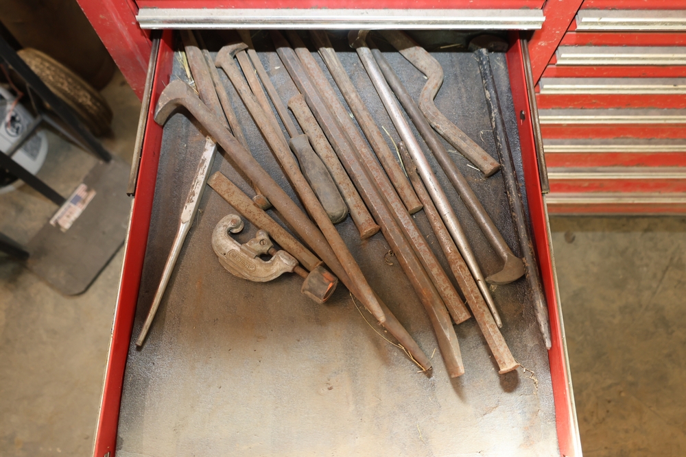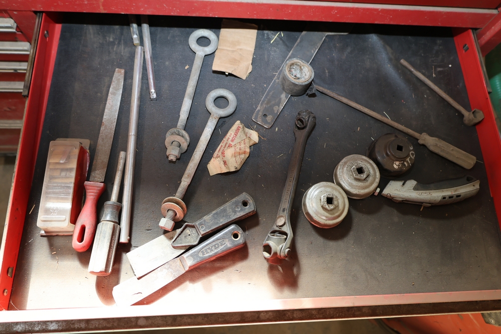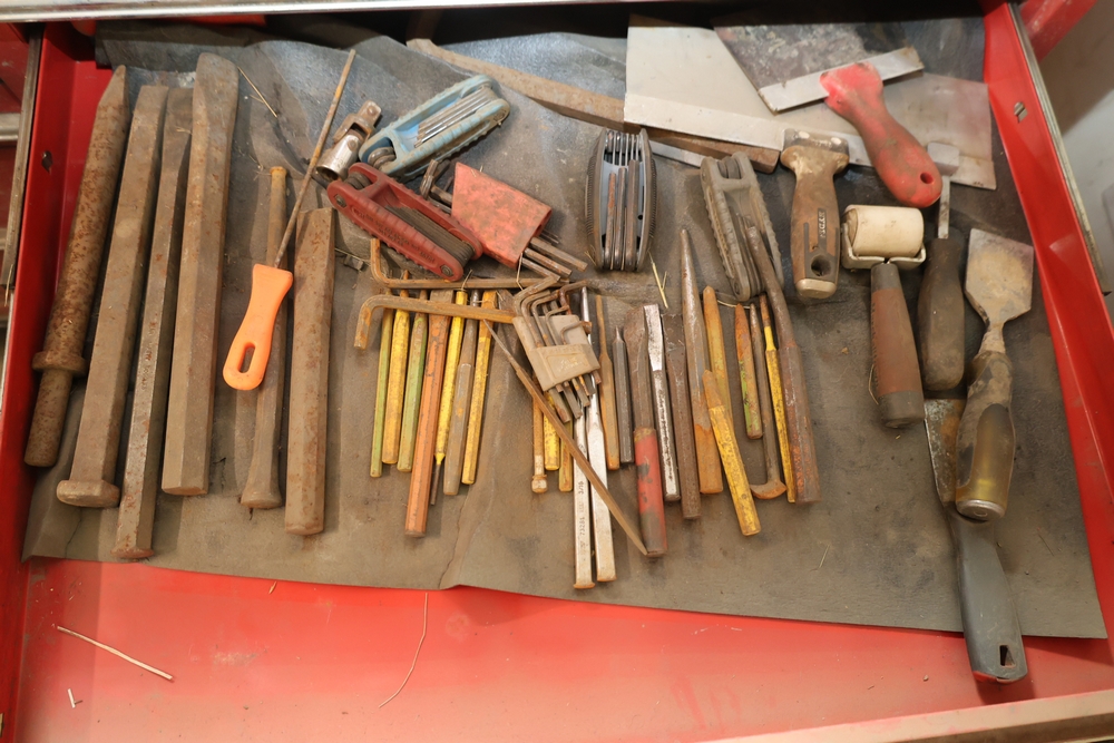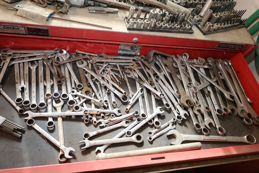 Matco rolling tool chest with multiple drawers, assorted sockets, socket trays, wrenches, pry bars, pliers, screwdrivers, hex keys, and miscellaneous hand tools; approximately 53 inches wide, 24 inches deep, and 40 inches tall.
