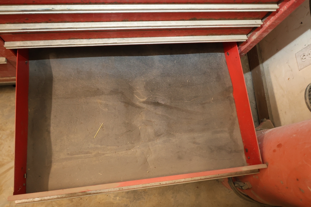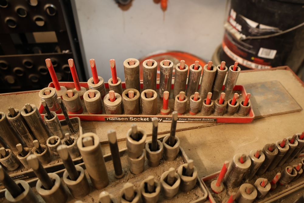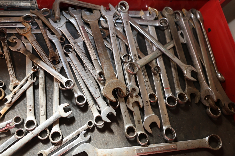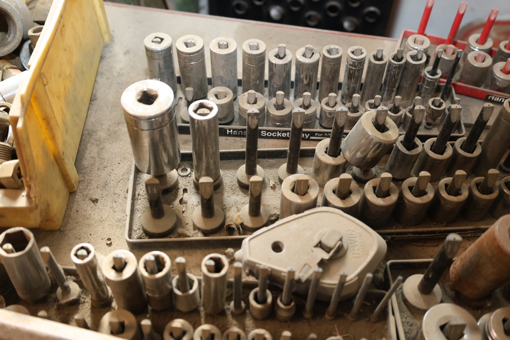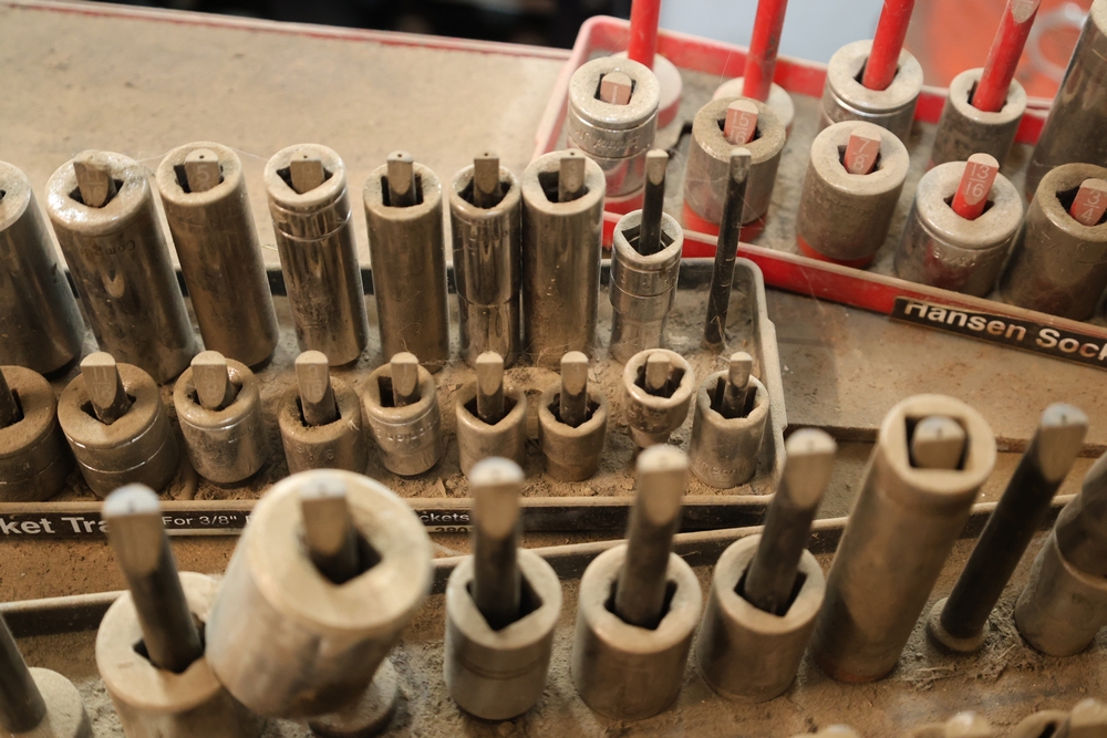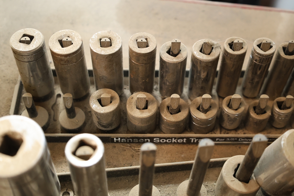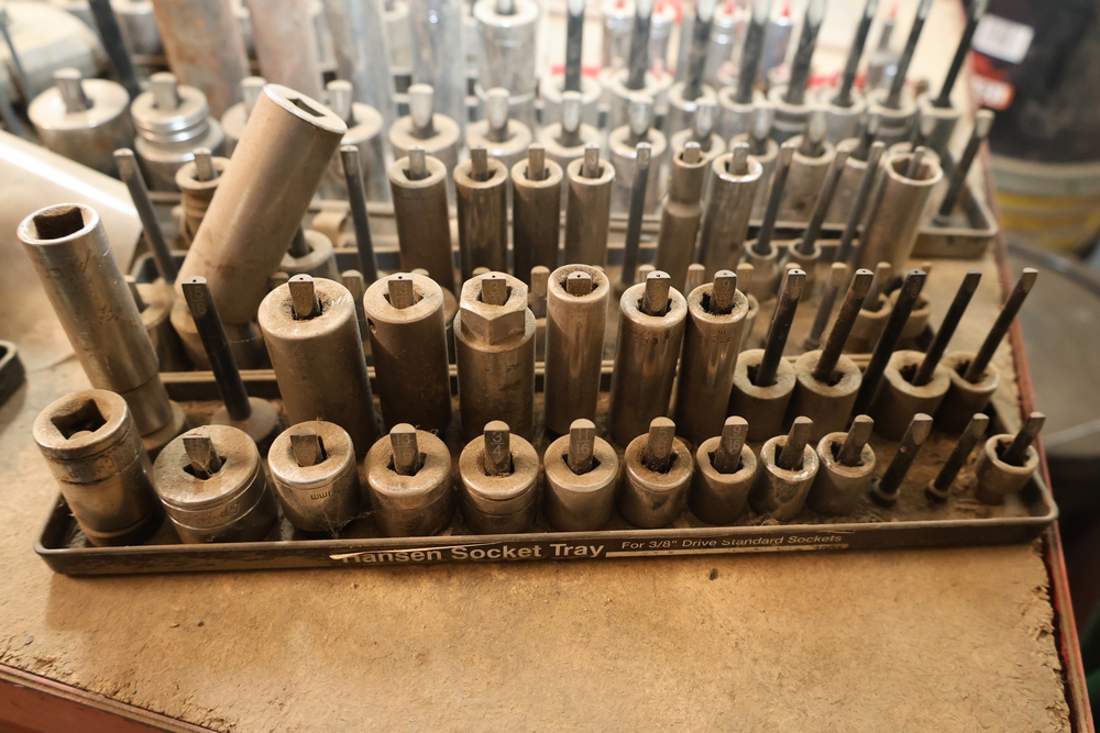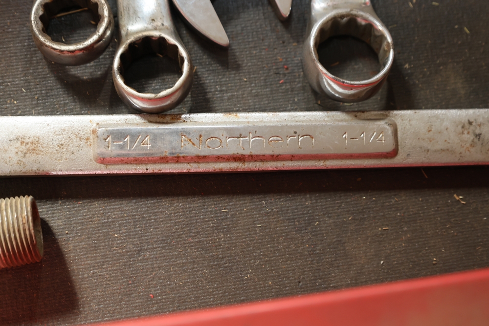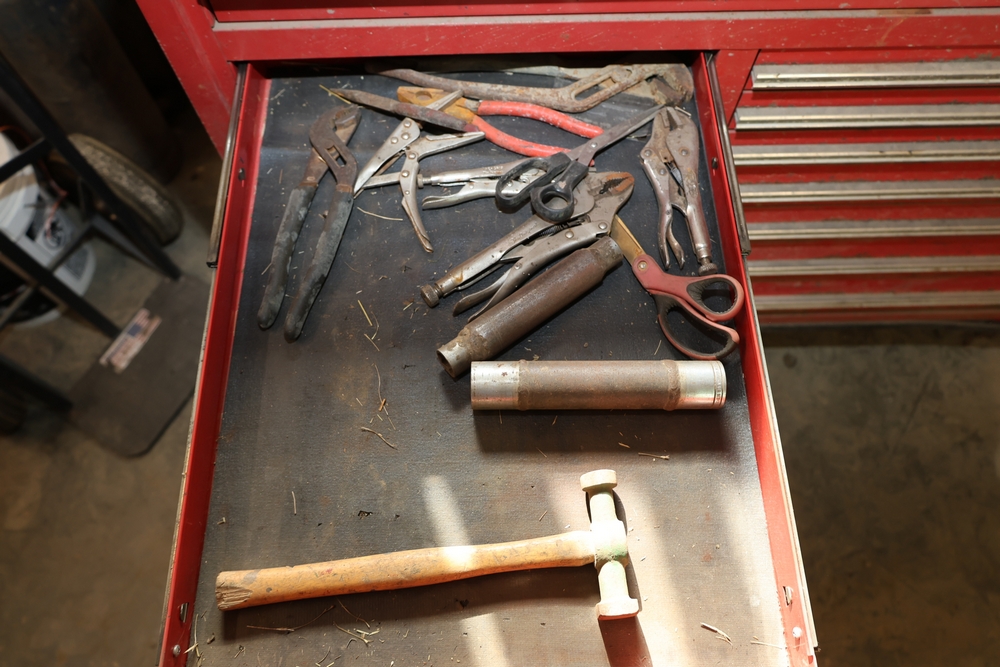 Matco rolling tool chest with multiple drawers, assorted sockets, socket trays, wrenches, pry bars, pliers, screwdrivers, hex keys, and miscellaneous hand tools; approximately 53 inches wide, 24 inches deep, and 40 inches tall.