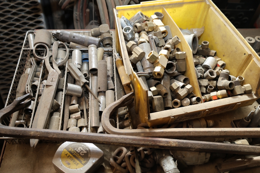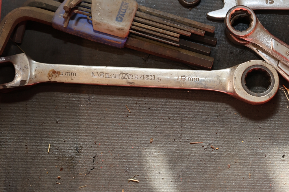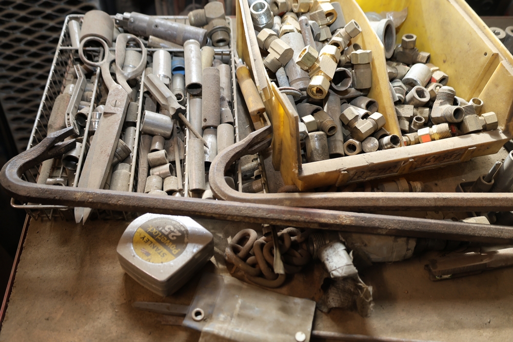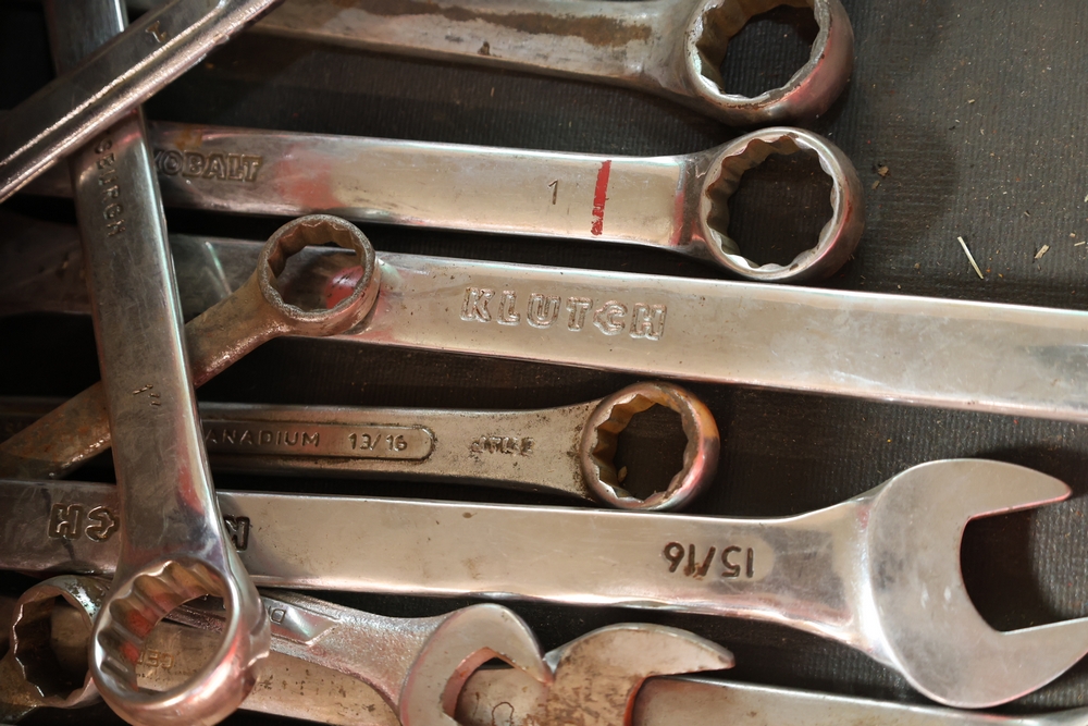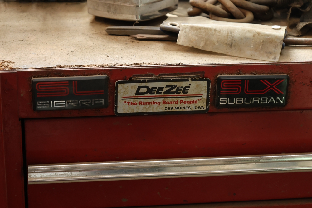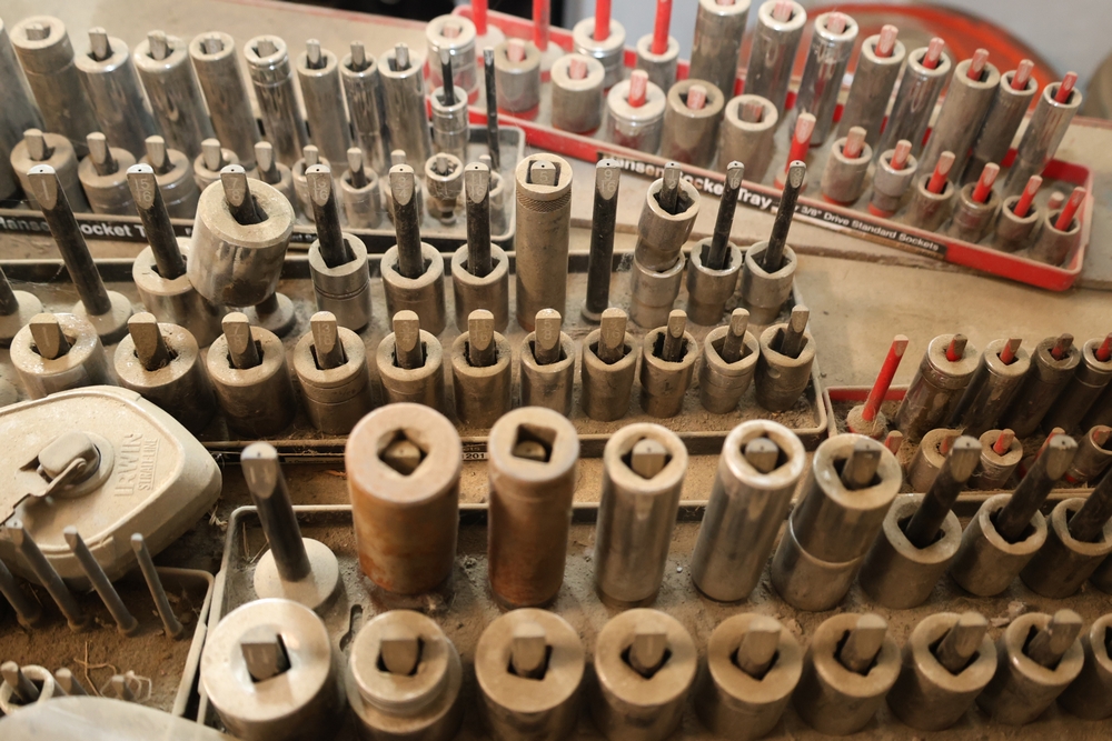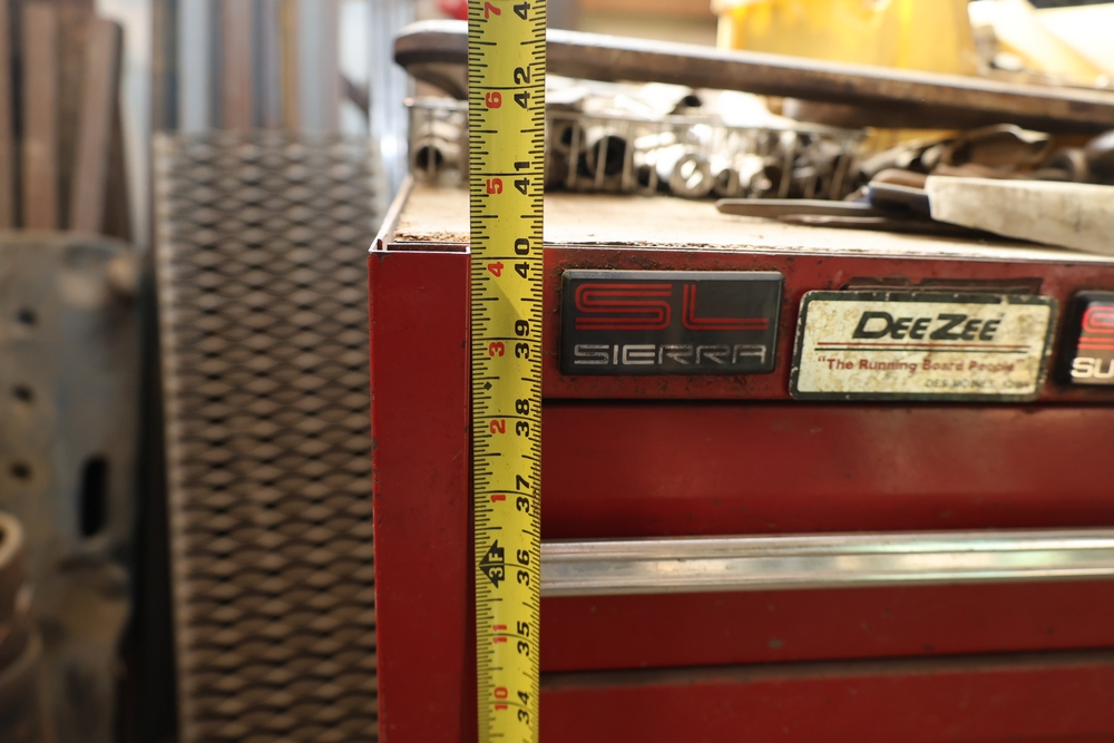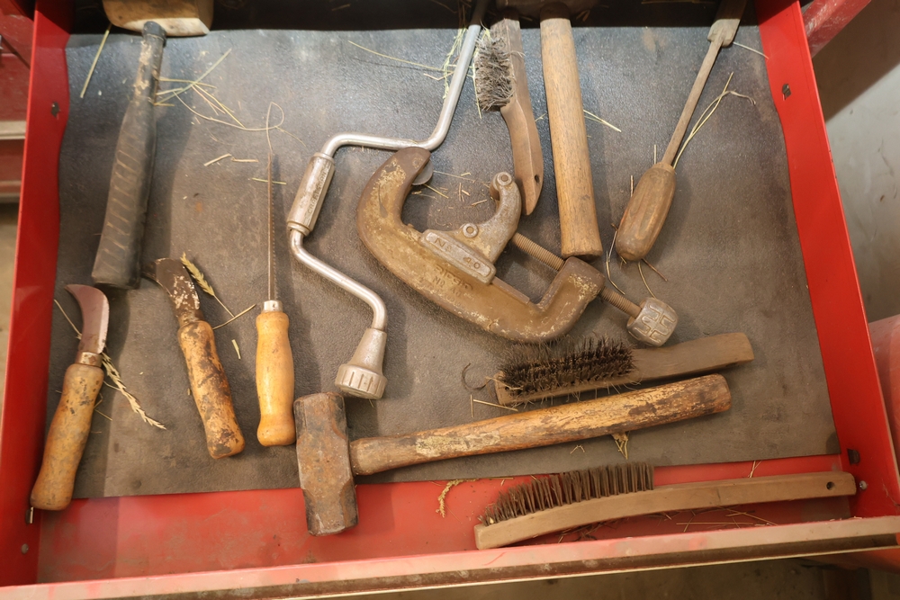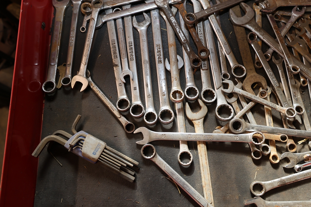 Matco rolling tool chest with multiple drawers, assorted sockets, socket trays, wrenches, pry bars, pliers, screwdrivers, hex keys, and miscellaneous hand tools; approximately 53 inches wide, 24 inches deep, and 40 inches tall.