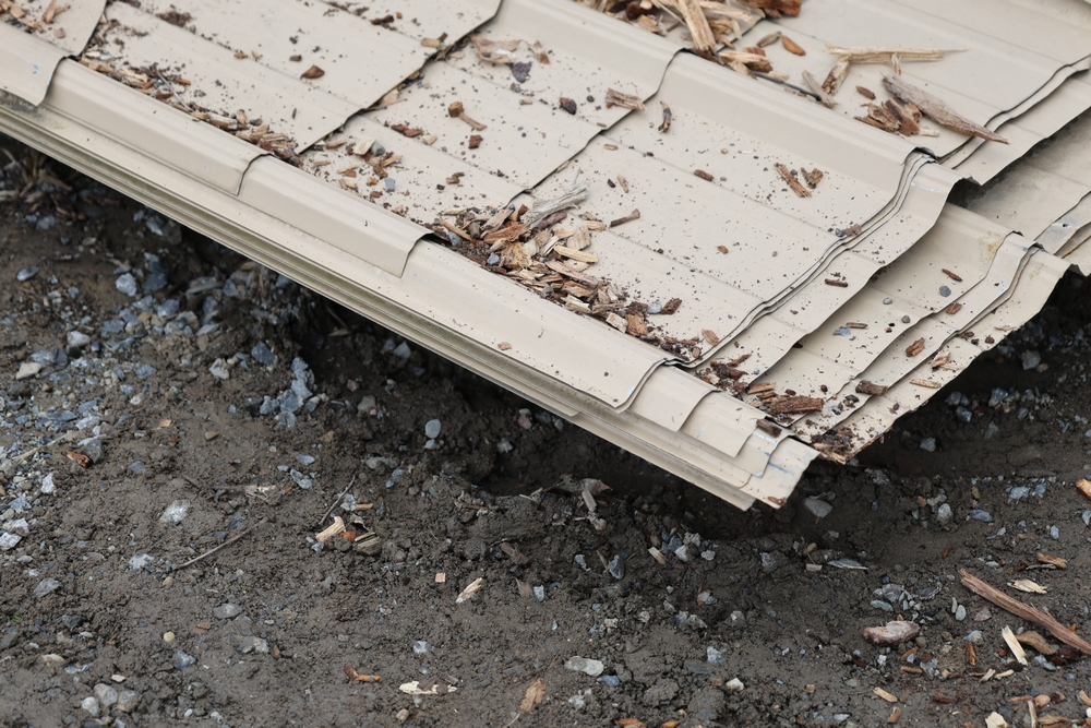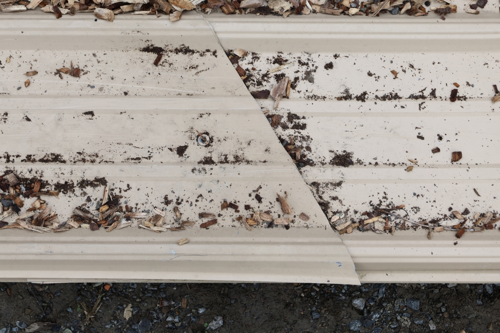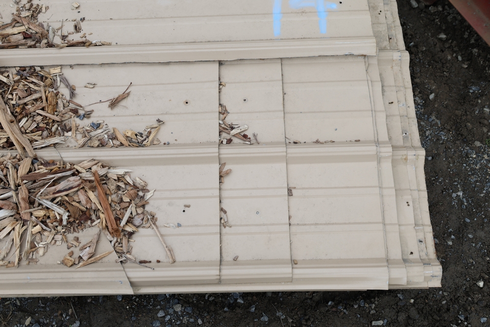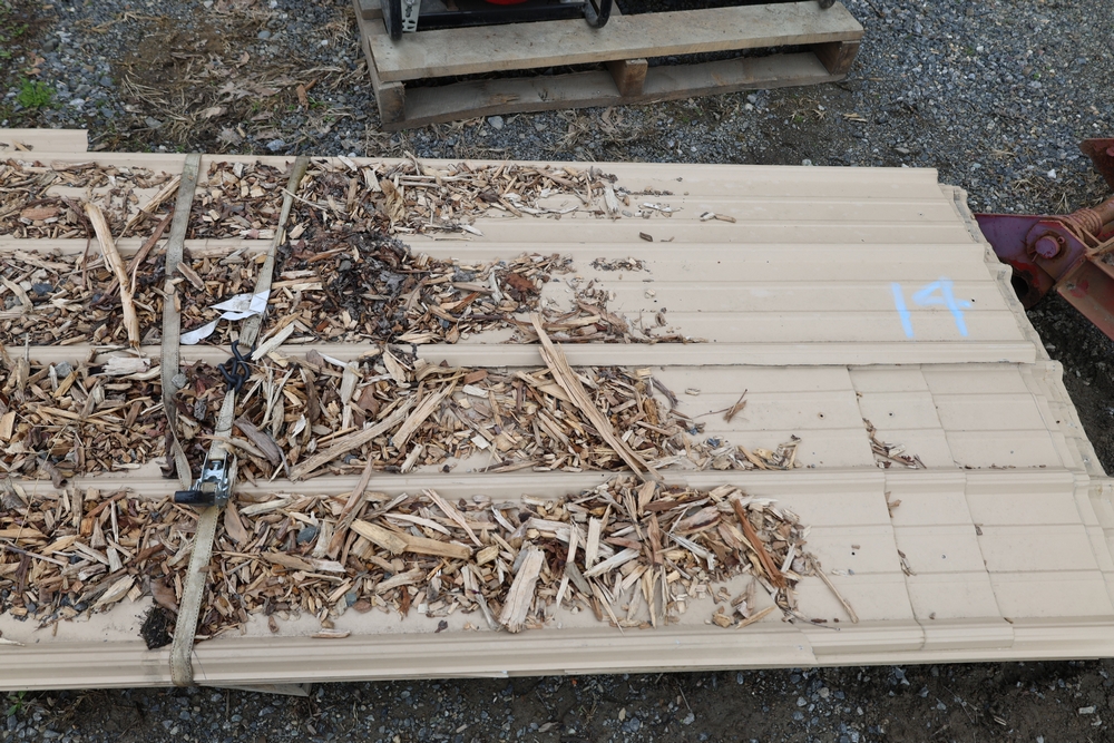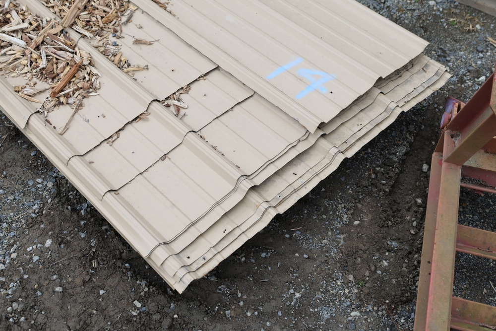 Stack of previously used metal roofing panels, various lengths with some cut sections and angled ends, with fastener holes.
