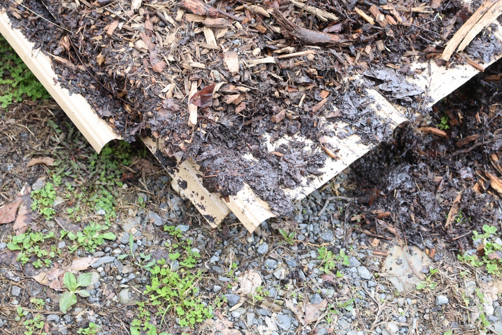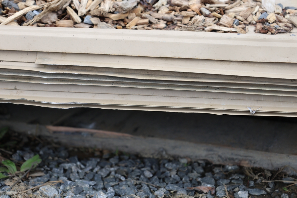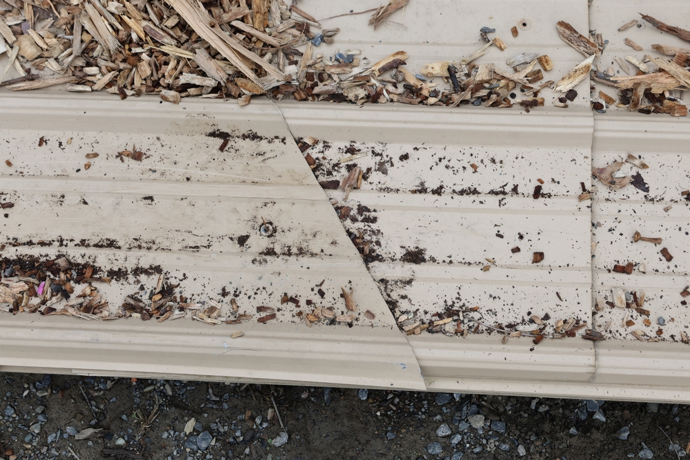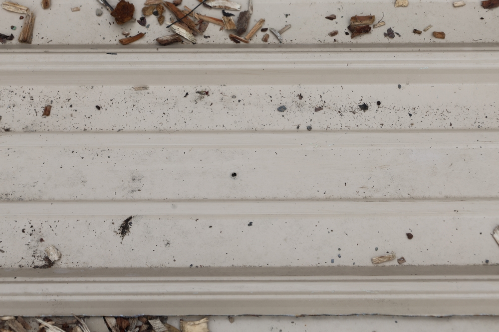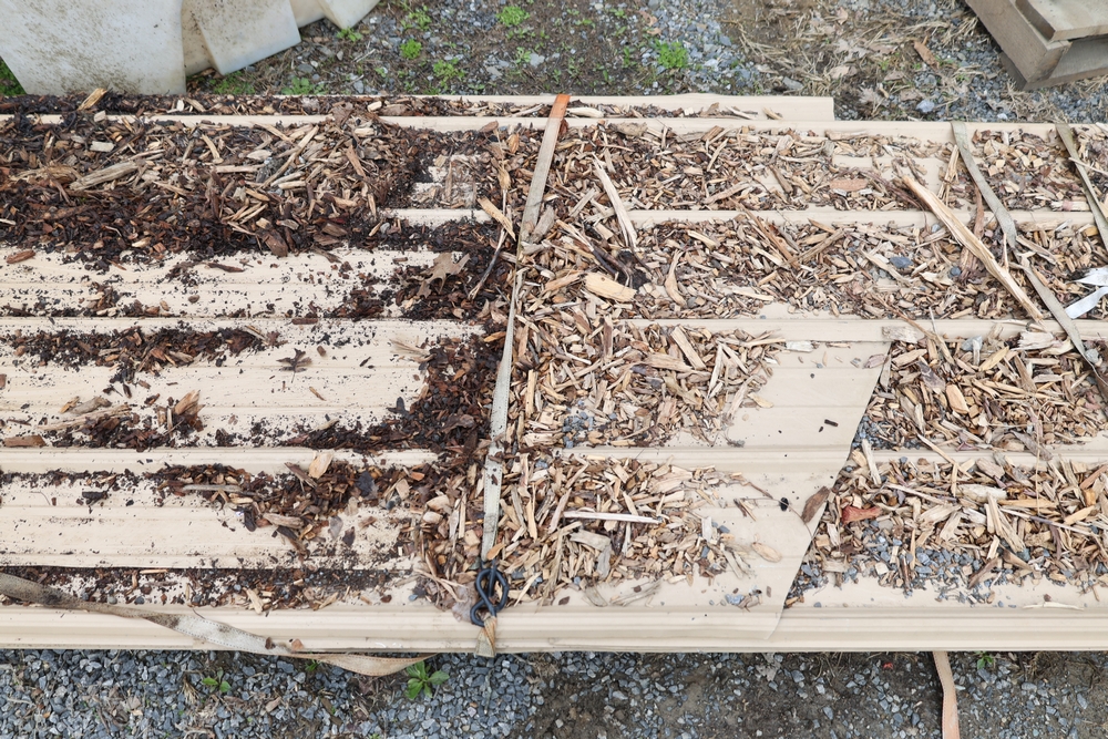 Stack of previously used metal roofing panels, various lengths with some cut sections and angled ends, with fastener holes.