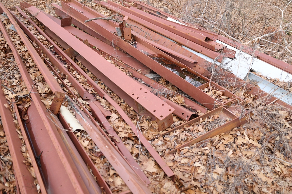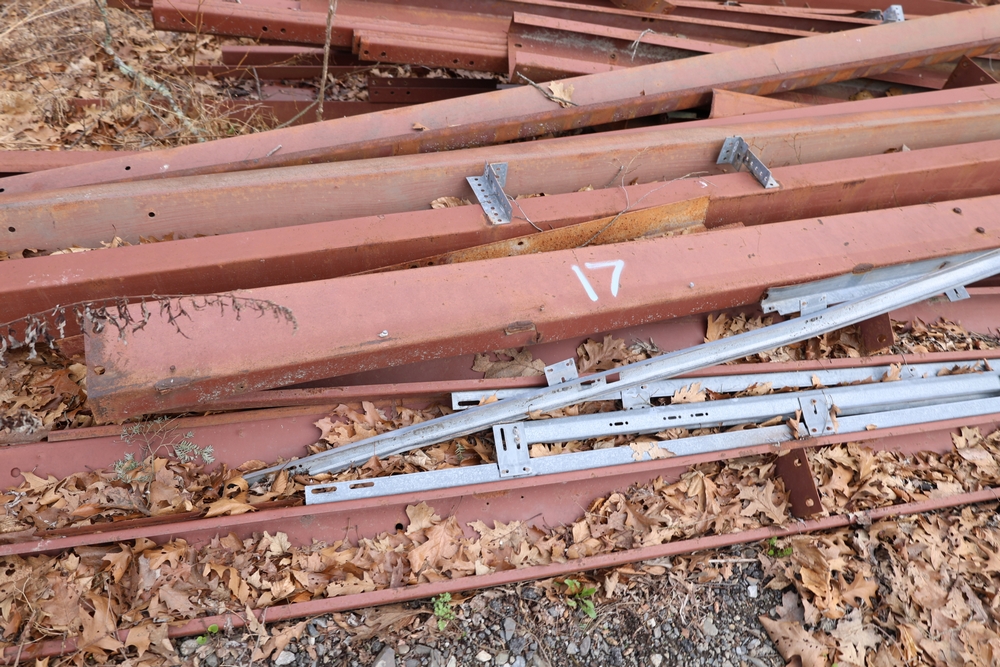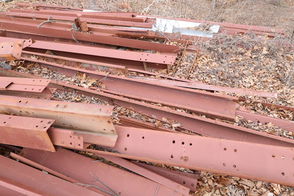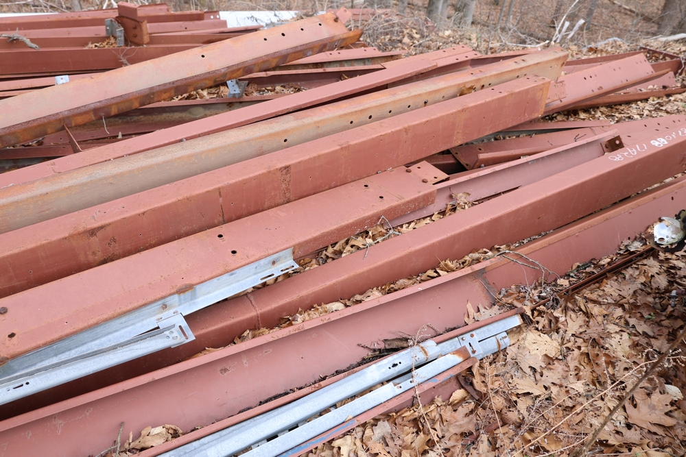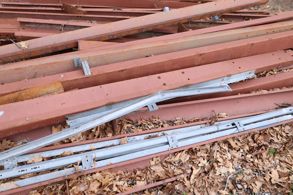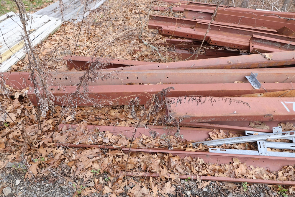Structural steel components and metal panels from 30 ft x 50 ft building, including red painted beams, posts, and framing members with pre-drilled connection holes; additional galvanized and painted metal panels and trim pieces; mixed lengths and profiles.