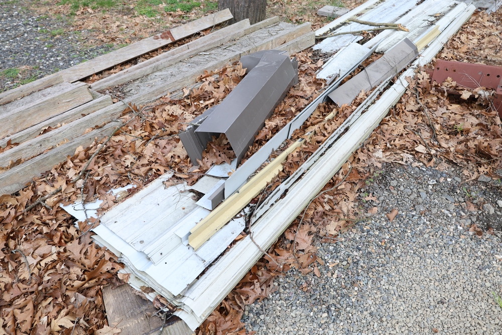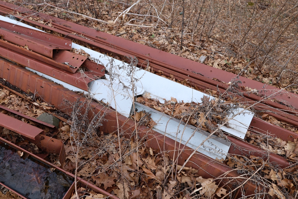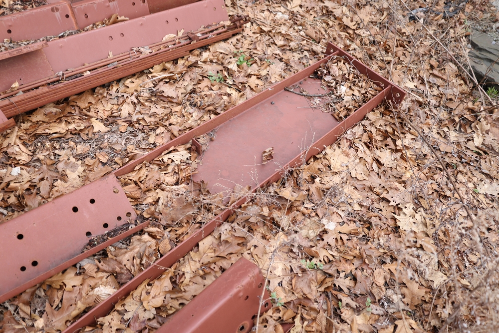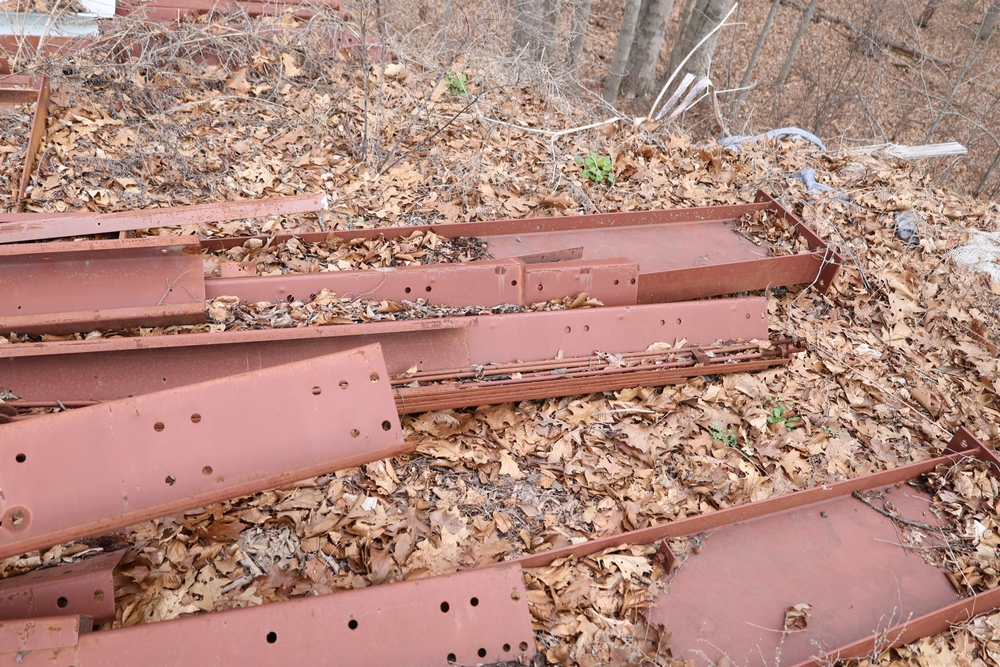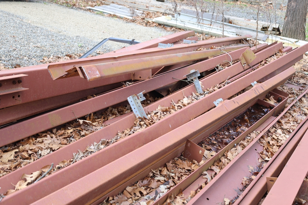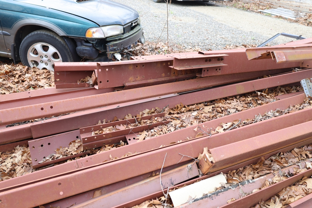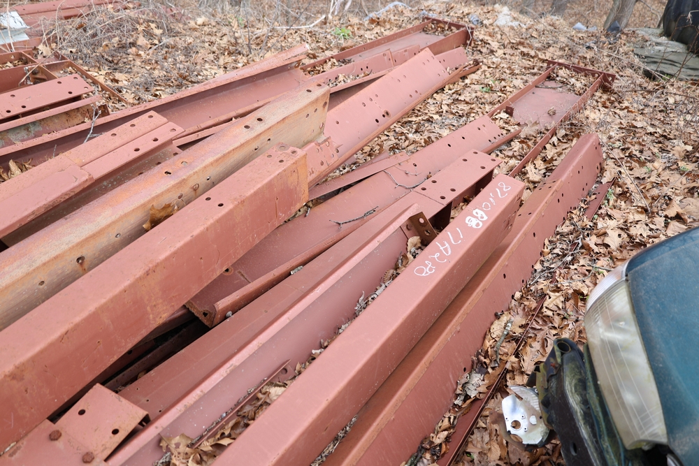 Structural steel components and metal panels from 30 ft x 50 ft building, including red painted beams, posts, and framing members with pre-drilled connection holes; additional galvanized and painted metal panels and trim pieces; mixed lengths and profiles.