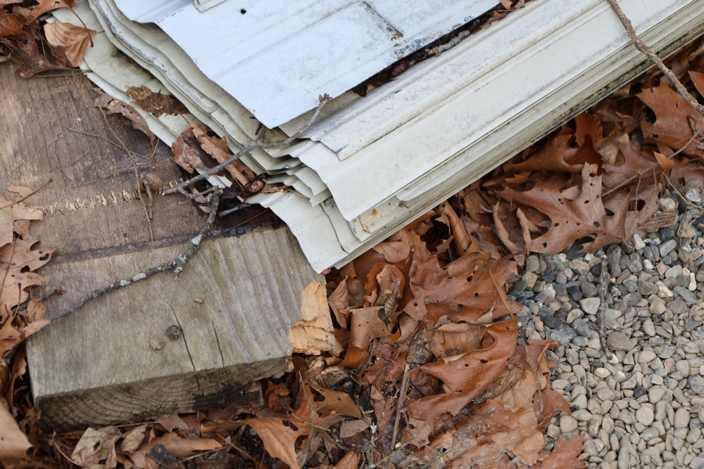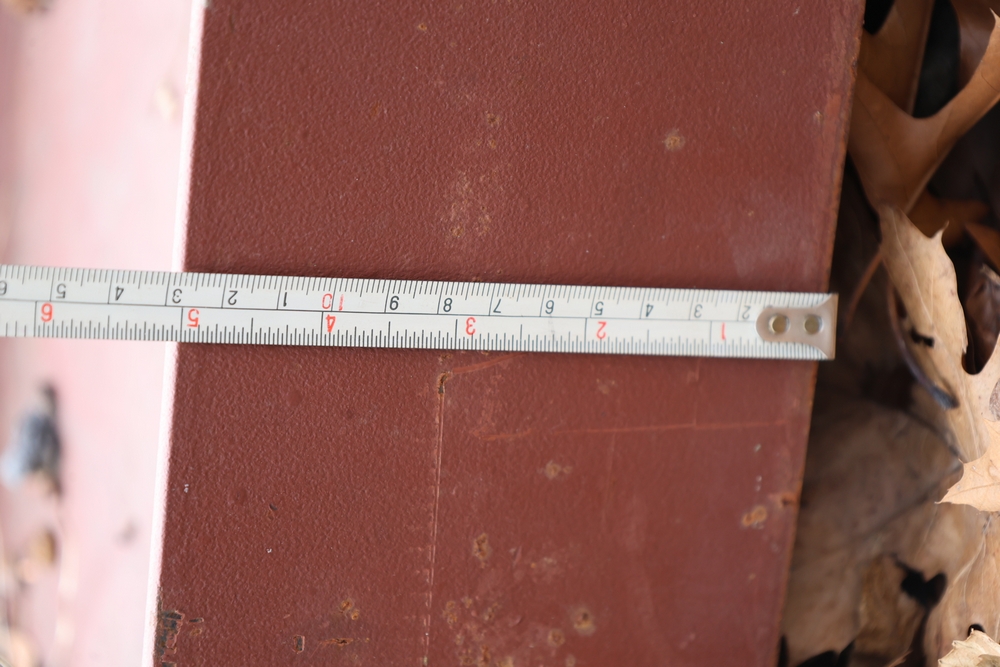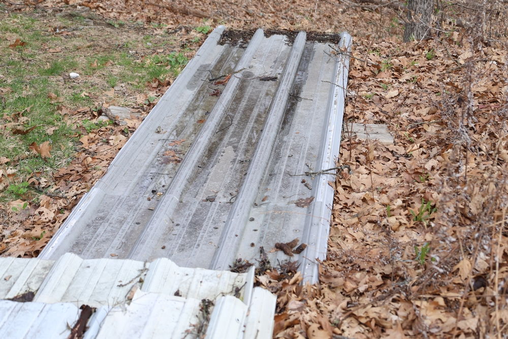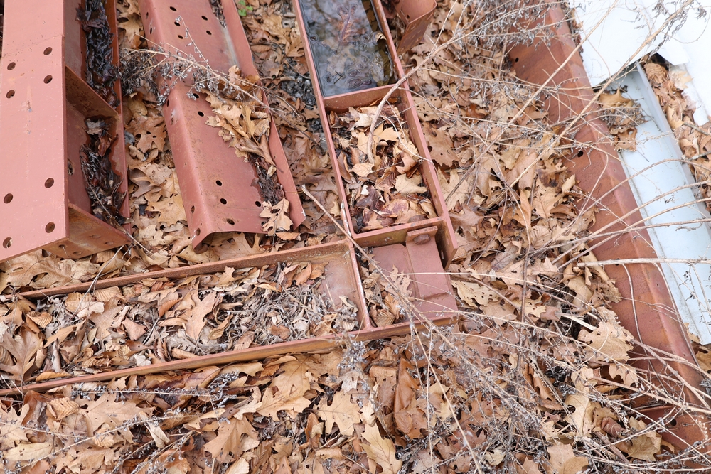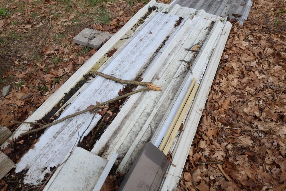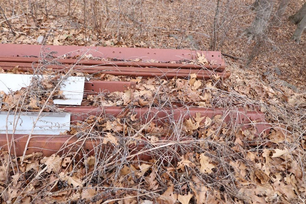 Structural steel components and metal panels from 30 ft x 50 ft building, including red painted beams, posts, and framing members with pre-drilled connection holes; additional galvanized and painted metal panels and trim pieces; mixed lengths and profiles.