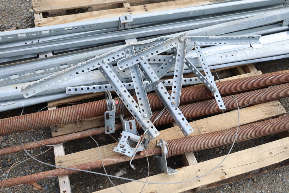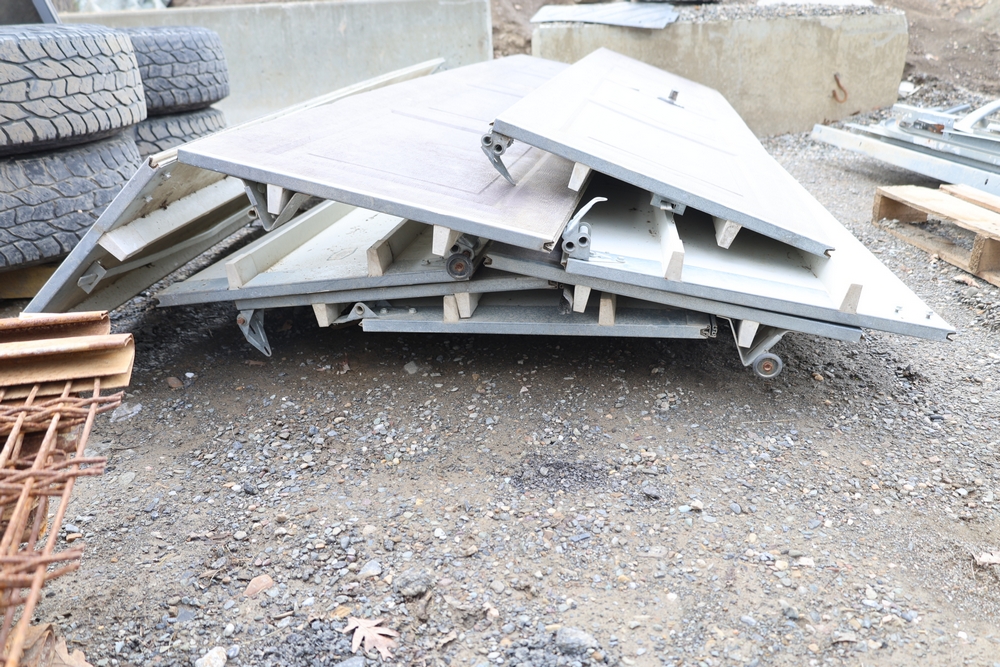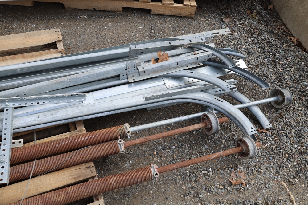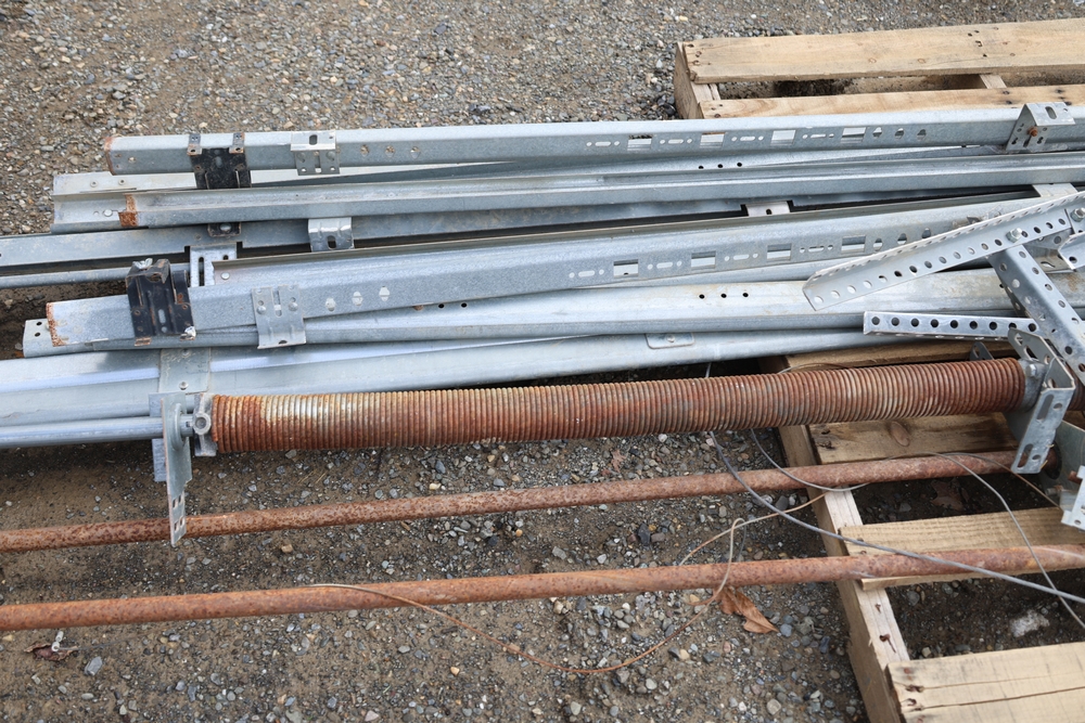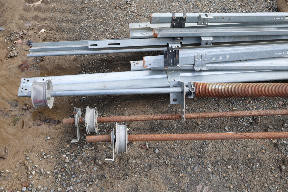 Mixed lot of metal door hardware including rails, brackets, springs, and pulleys; includes eight panels measuring approximately 9 ft wide by 2 ft.