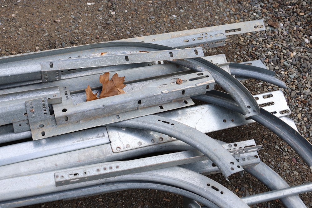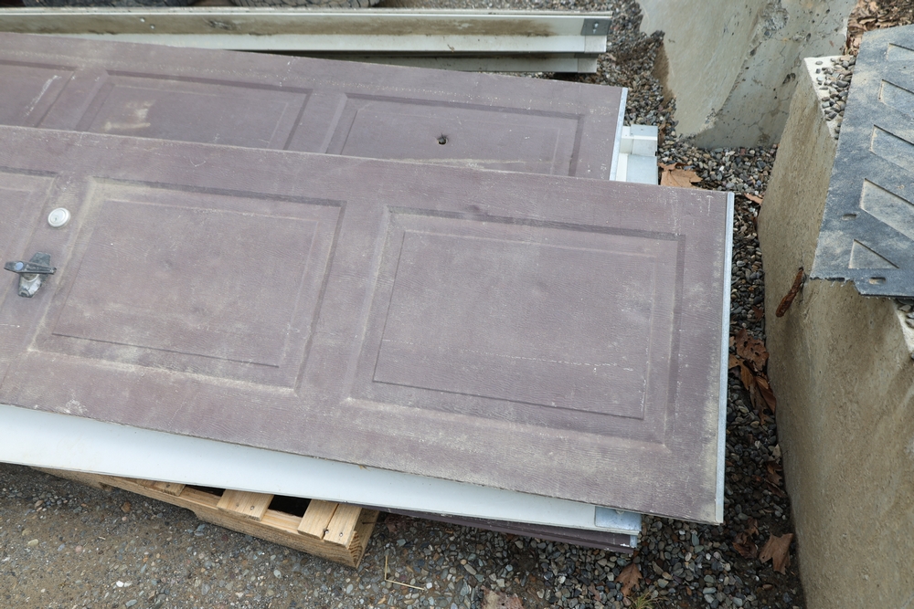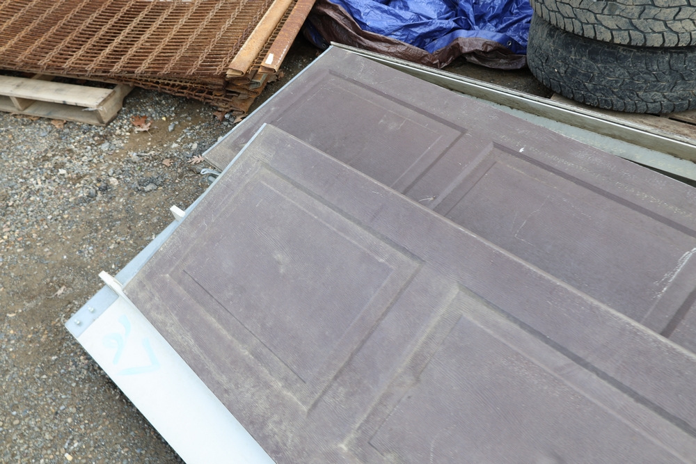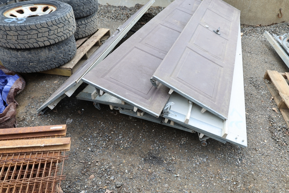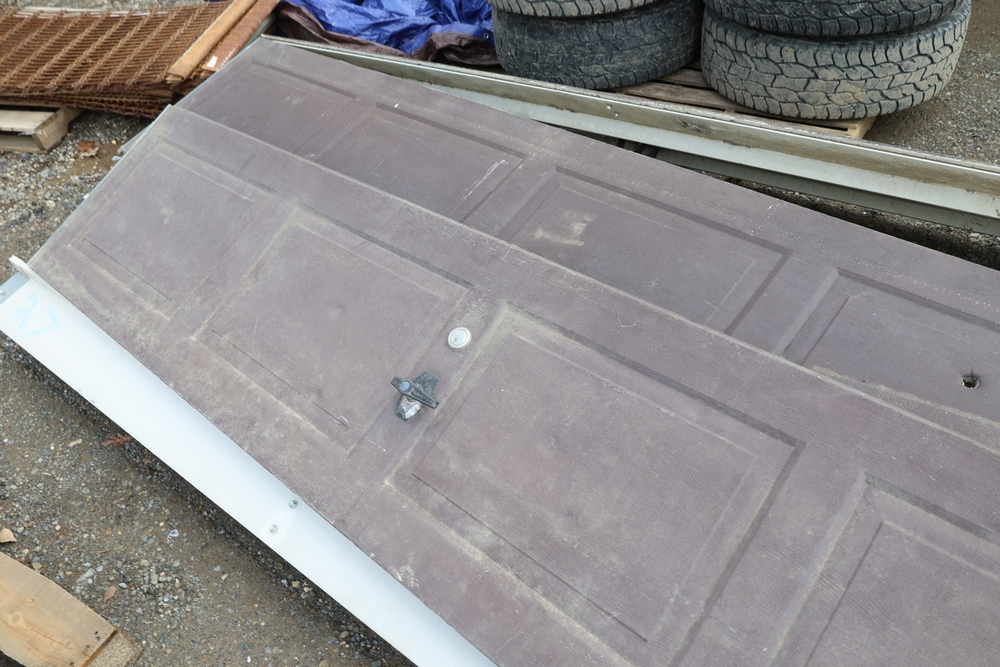 Mixed lot of metal door hardware including rails, brackets, springs, and pulleys; includes eight panels measuring approximately 9 ft wide by 2 ft.