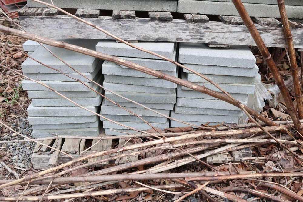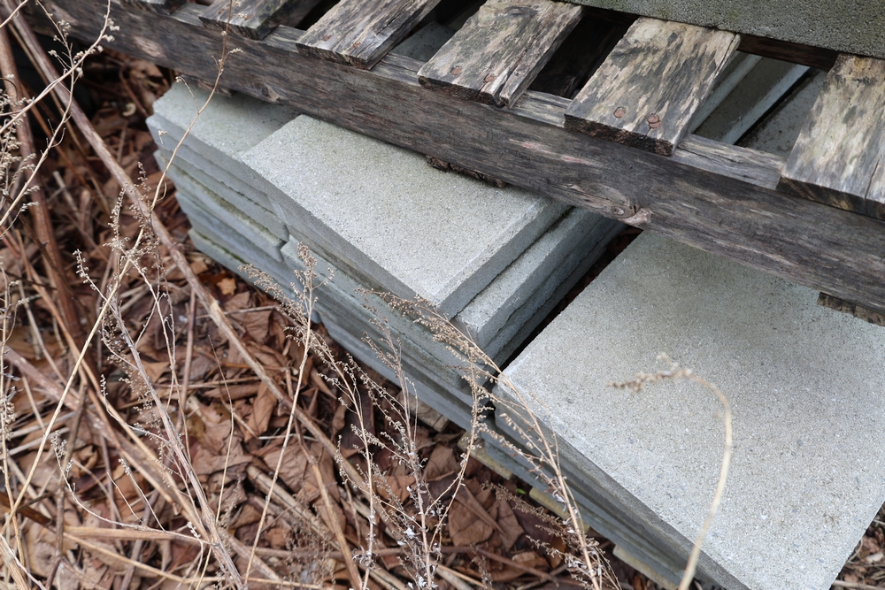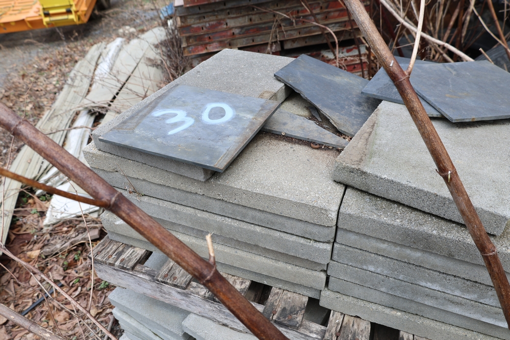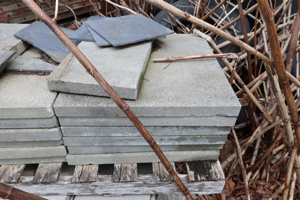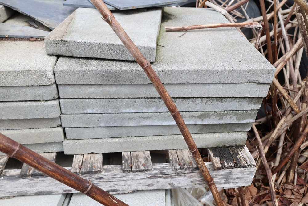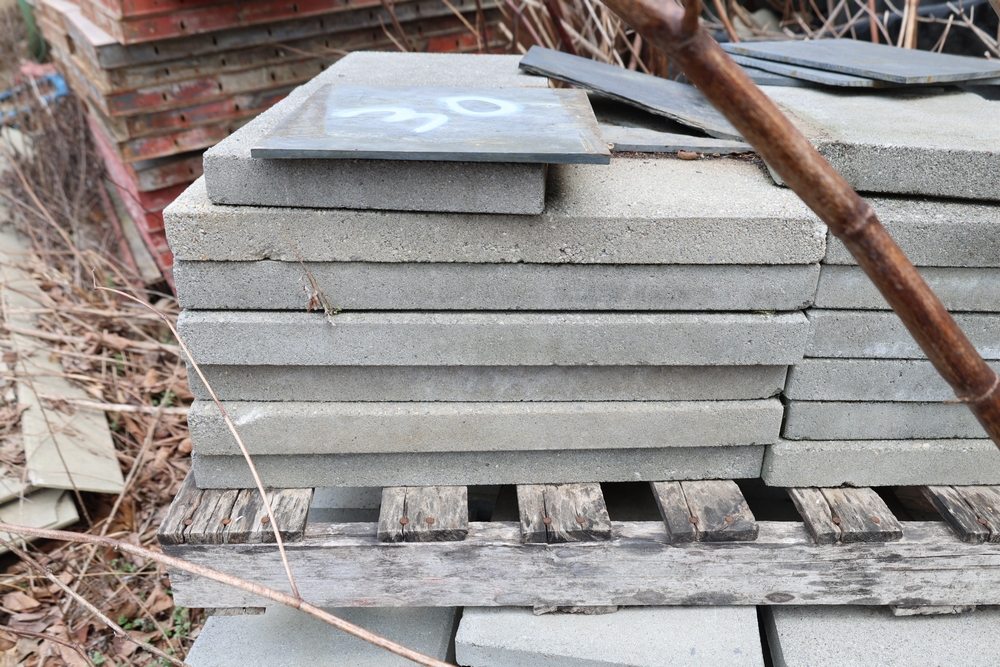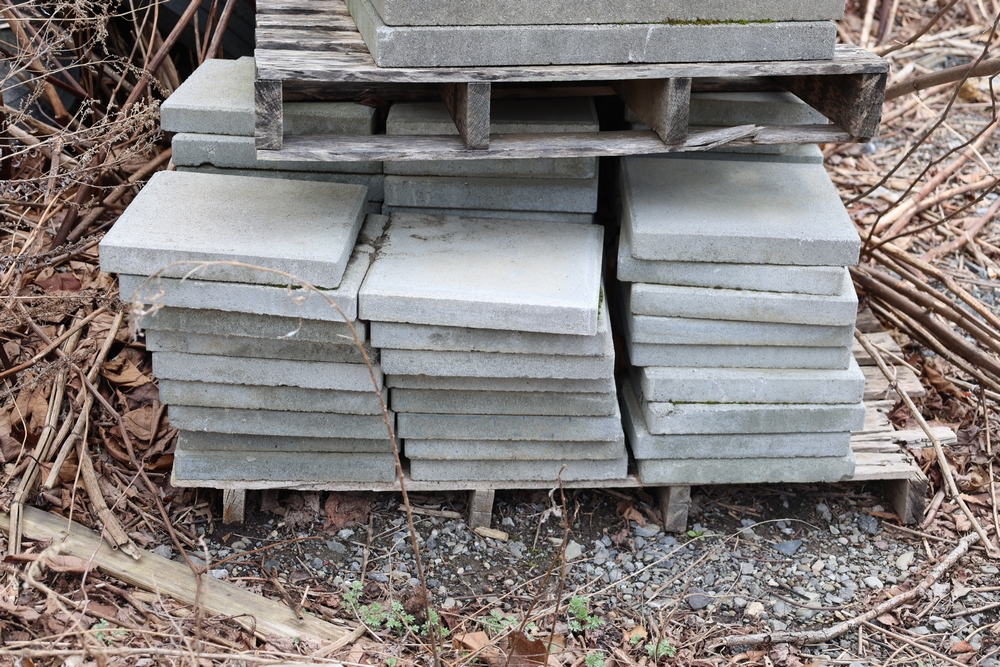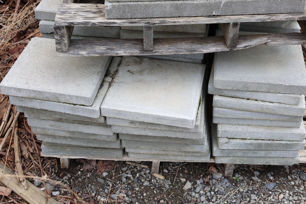 Stack of concrete patio pavers including approximately 2 ft square and 1 ft square pieces; includes several smaller square pavers on top.