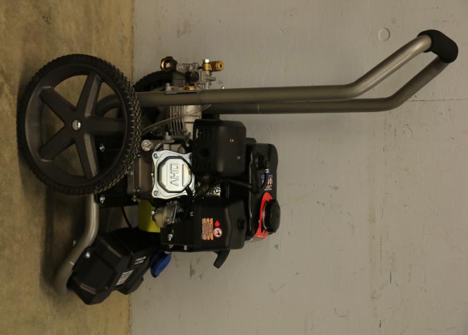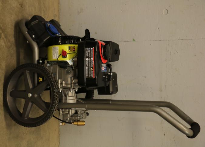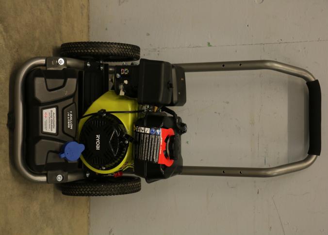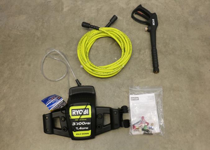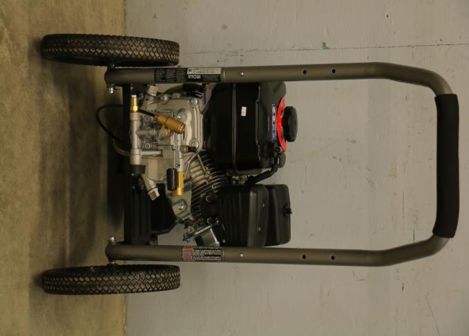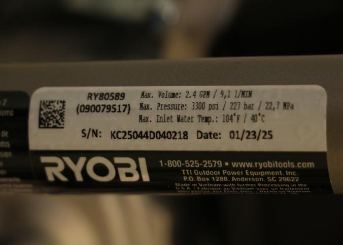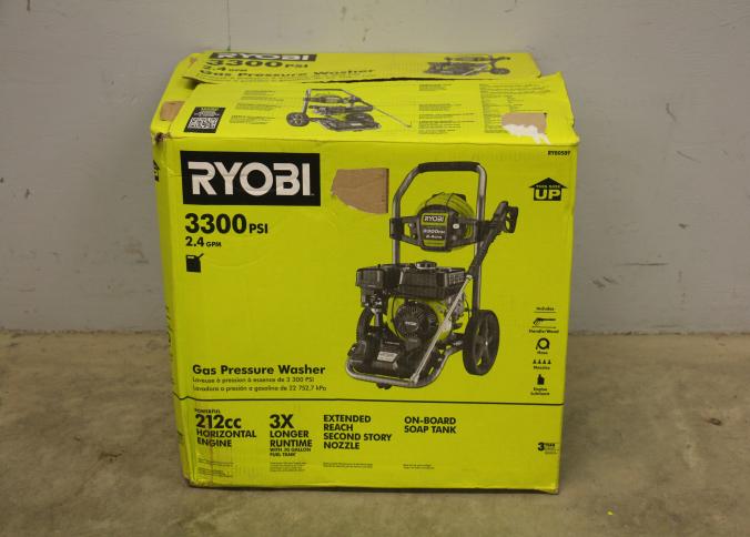 Ryobi 3300 PSI Gas Powered Pressure Washer with Accessories, Model RY80589. Includes pressure hose, spray gun, nozzles, detergent siphon tube, and operator's manual. Features 2.4 GPM (Gallons Per Minute) maximum flow rate and a steel frame with large wheels for portability. Includes original box. Hardware not included. Pickup only.