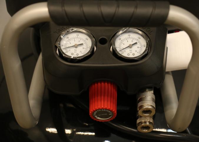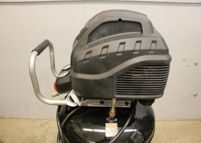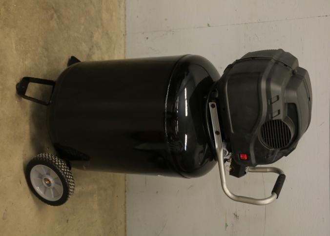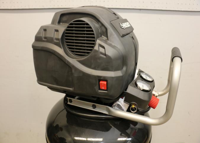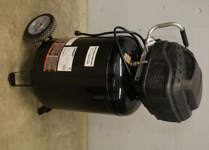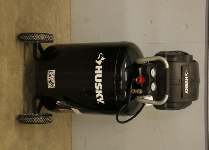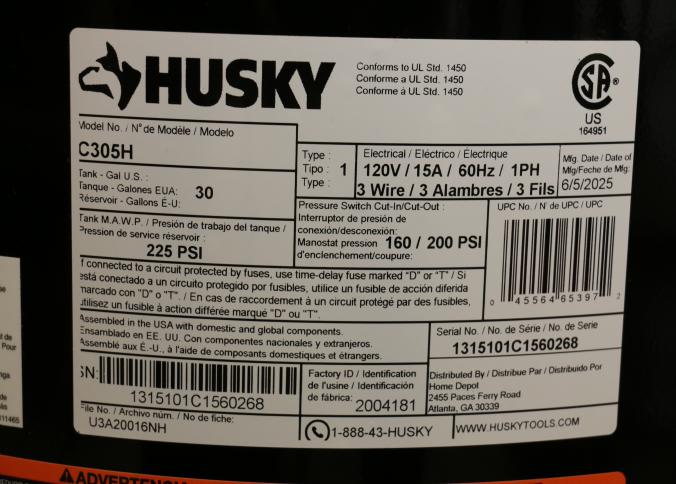 Husky 30-Gallon Portable Air Compressor, Model C305H. Features an oil-free electric motor with a maximum psi of 225 and a 120V/15A power requirement. Includes a pressure switch with cut-in at 160 psi and cut-out at 200 psi. Has handle, wheels, and dual gauges for pressure monitoring. Pickup only.