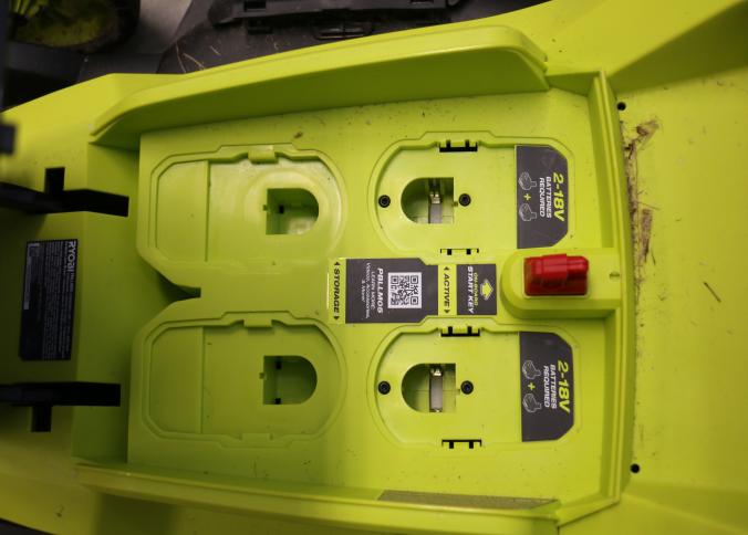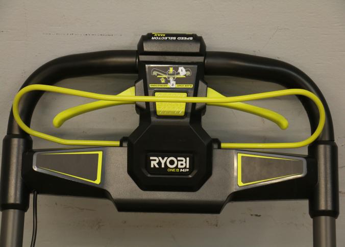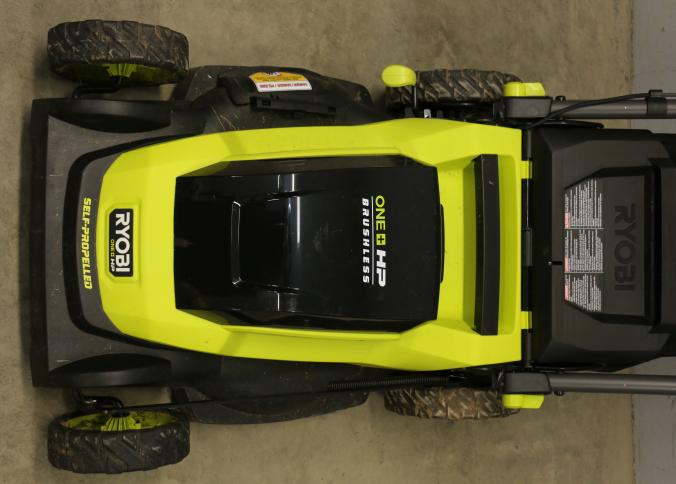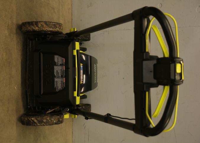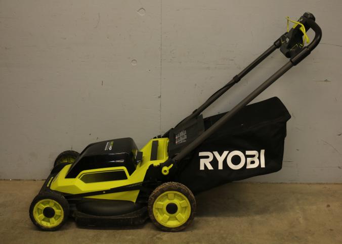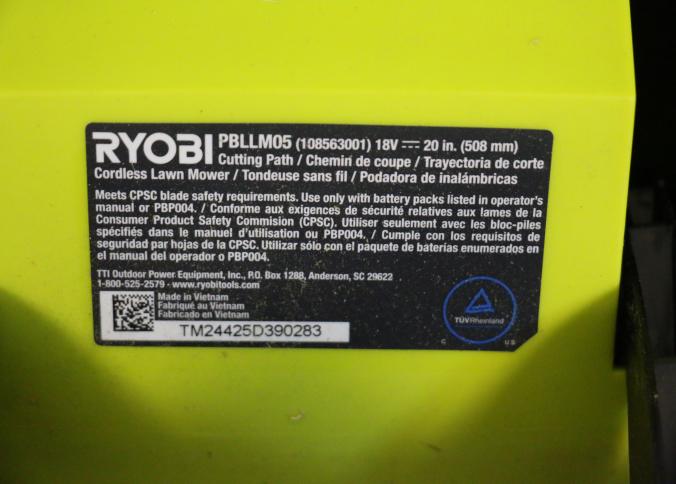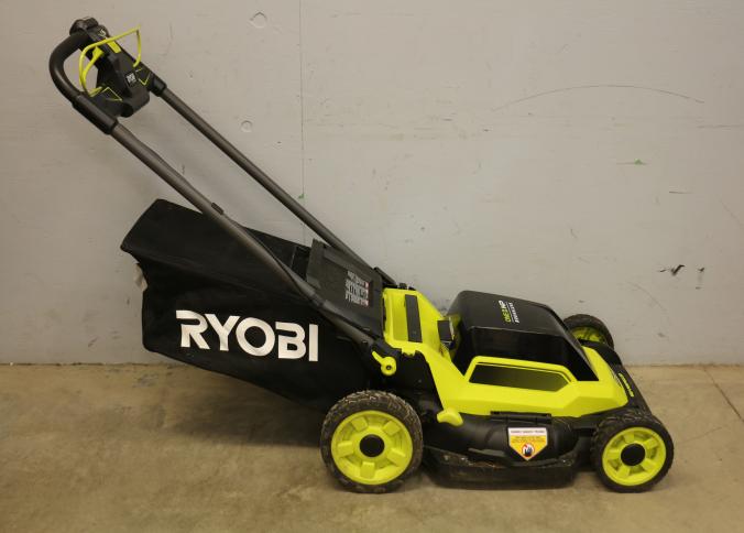 Ryobi 18V 20-Inch Cordless Lawn Mower, Model PBLLM05, featuring a ONE+ HP brushless motor and 20-inch cutting path. Includes dual battery compartments for extended run time, a rear collection bag, and adjustable handle for user comfort. Does not include 18v batteries. Pickup only.