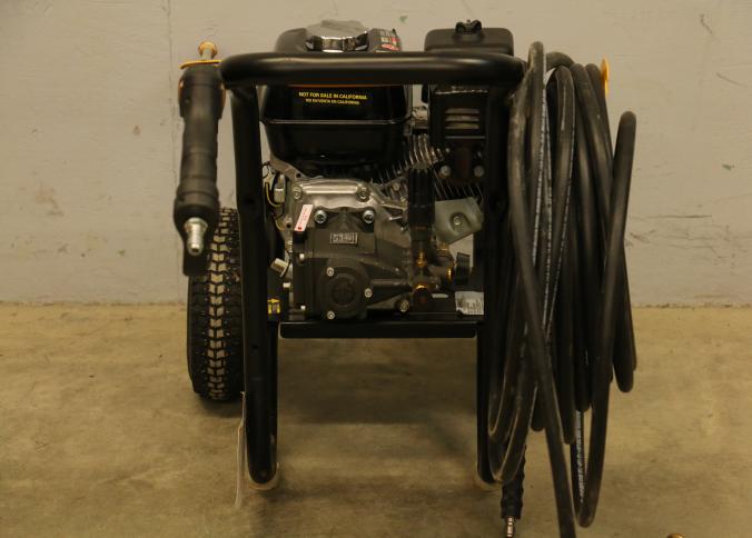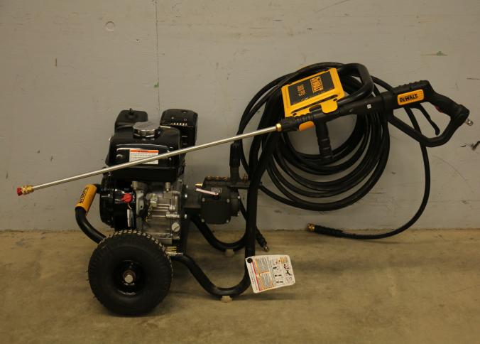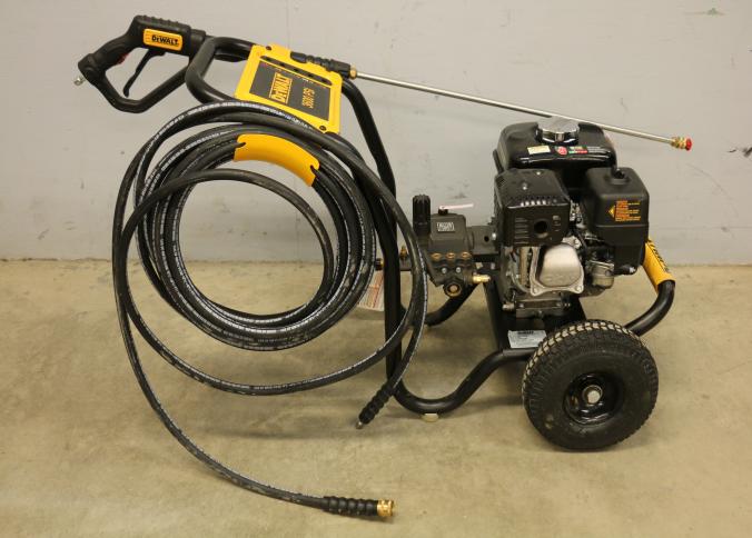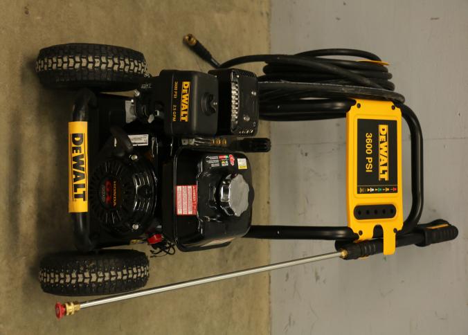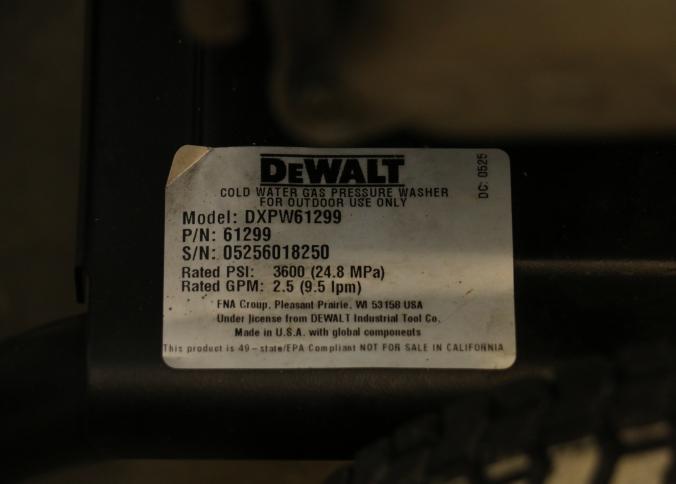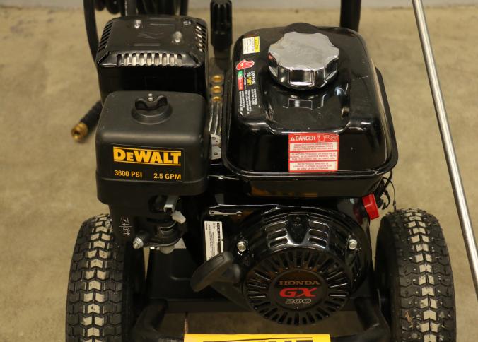 DeWalt Cold Water Gas Pressure Washer Model DXPW61299, rated at 3600 PSI and 2.5 GPM. Powered by a Honda GX engine with a sturdy frame, pneumatic tires, and attached hose and spray wand. Hardware not included. Pickup only.