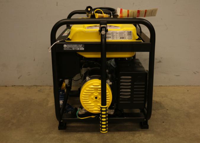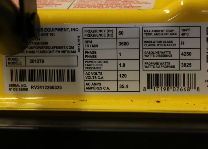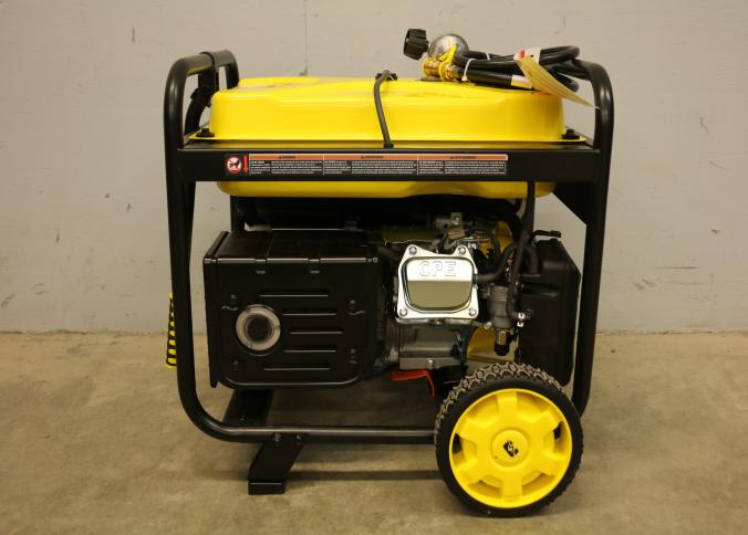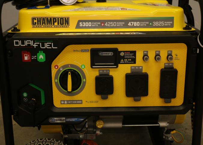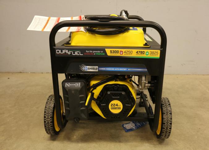 Champion Dual-Fuel Portable Generator, Model 201279. Features dual-fuel capability with starting watts of 5300 and running watts of 4250 (gasoline) or 3825 (propane). Equipped with a 224cc engine, multiple outlets, and a user-friendly control panel. Includes a propane hose with regulator. Pickup only.