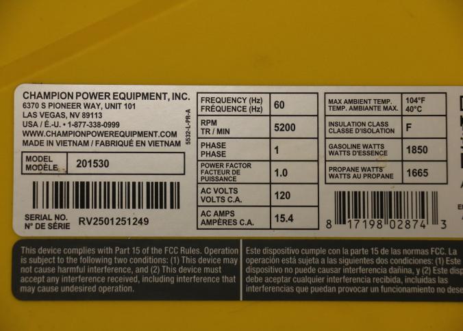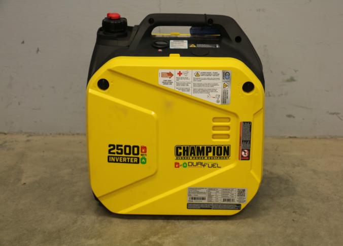 Champion 2500-Watt Dual Fuel Inverter Generator, Model 201530. Features 1850 running watts and 2500 starting watts, dual fuel capability for gasoline or propane, and ultra-quiet operation. Includes a compact portable design with multiple outlets and easy-to-use controls. Includes original box. Pickup only.