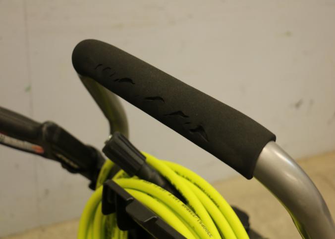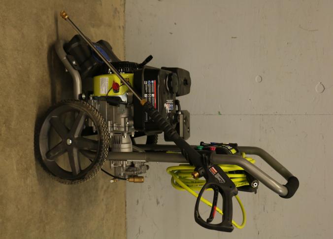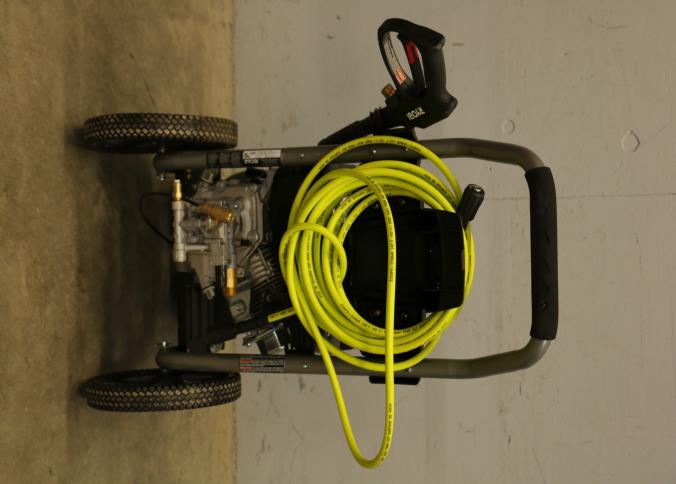 Ryobi 3300 PSI 2.4 GPM gas pressure washer, Model RY80589, with idle down functionality. Features a durable handle with padded grip, large wheels for mobility, and various nozzle attachments for versatile cleaning options. Includes a coiled hose and spray gun. Wheel is lose and foam handle has damage. Pickup only.