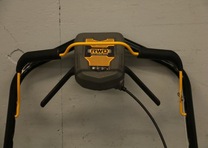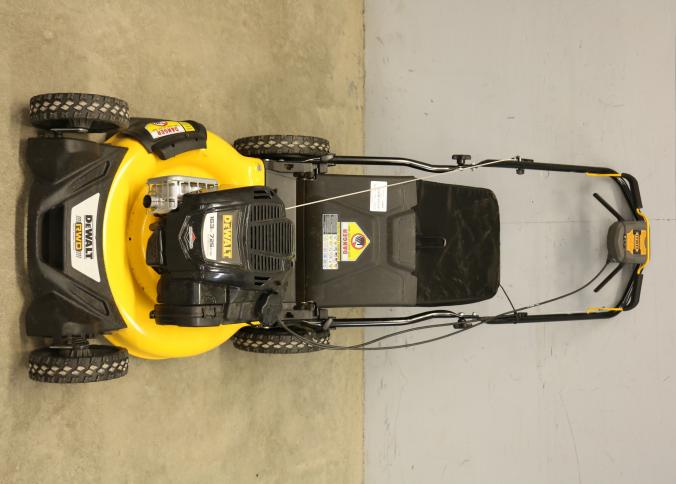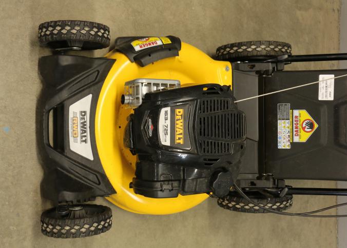 DeWalt Gas-Powered RWD Lawn Mower, Model 12AVP2R3739. Features a rear-wheel-drive system, Briggs & Stratton engine, large rear wheels for added traction, height-adjustable handle, and an attached grass collection bag. Pickup only.