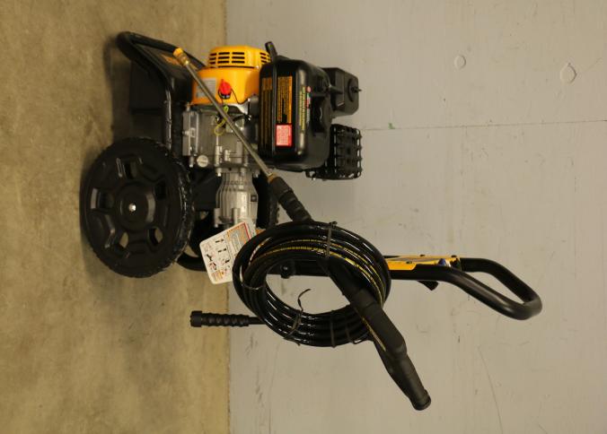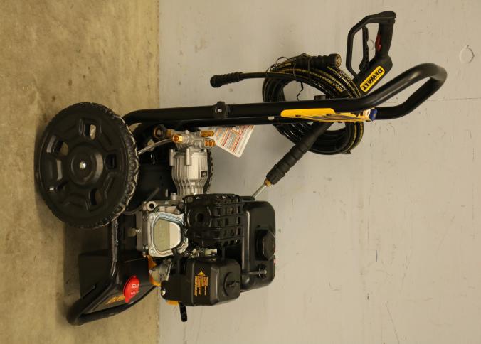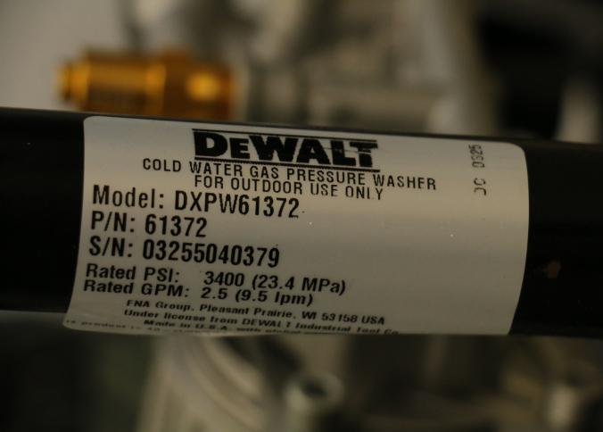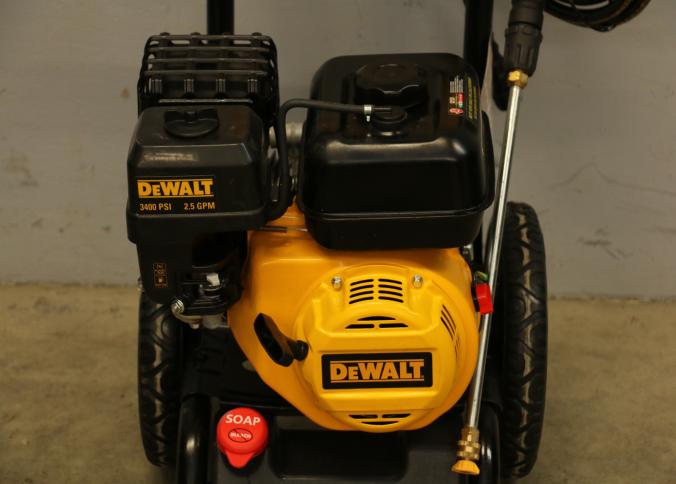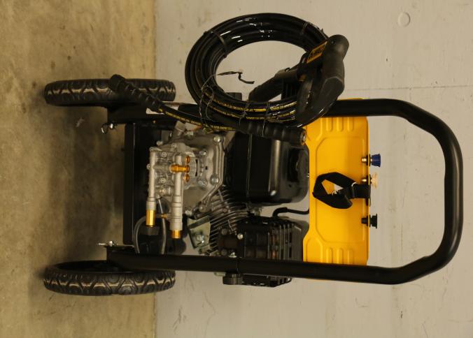 DeWalt 3400 PSI gas-powered pressure washer, Model DXPW616372, with a 2.5 GPM flow rate. Features a robust design with a yellow and black frame, large wheels for mobility, and an ergonomic spray wand. Equipped with detergent capability for efficient cleaning. Includes hoses and attachments. Pickup only.