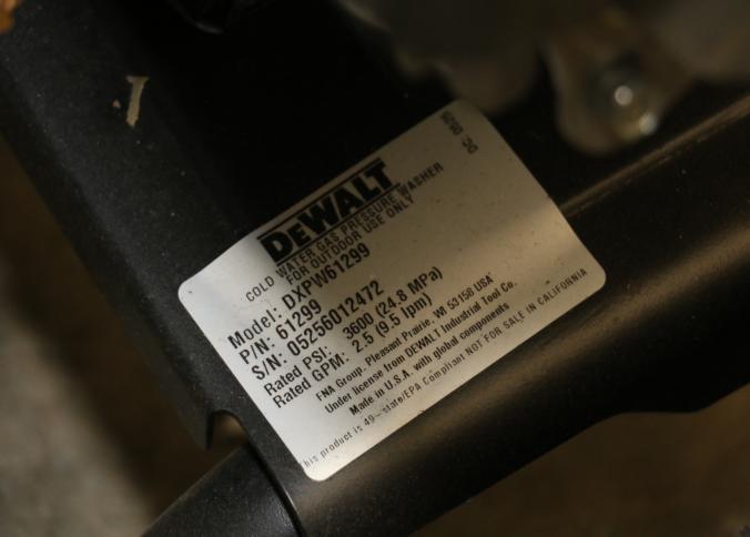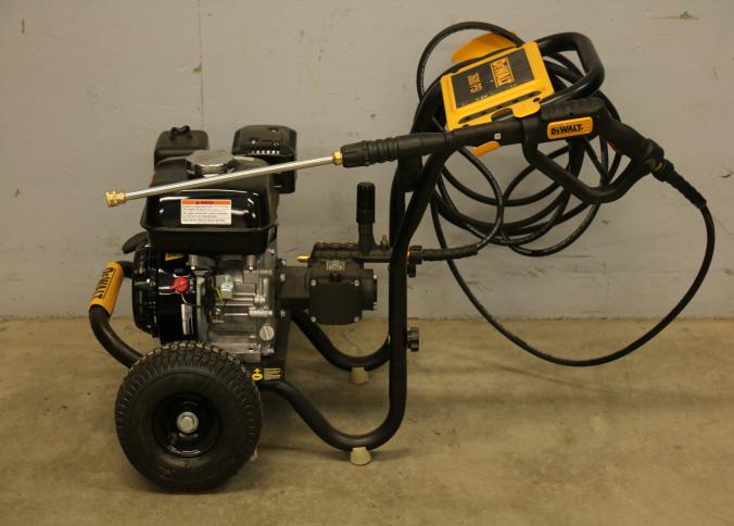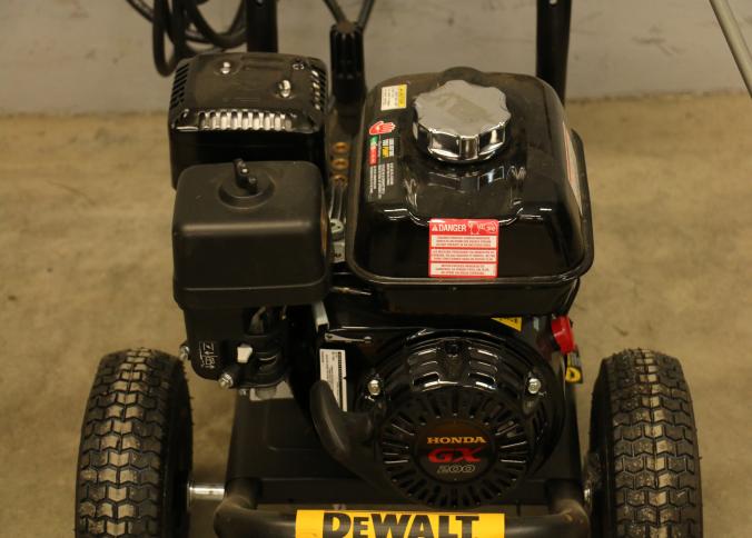 DeWalt 3600 PSI Gas Pressure Washer, Model DXPW61299. Features a Honda engine, hose, trigger handle, and spray wand. Includes large tires for mobility and a steel frame for durability. Rated for 2.5 gallons per minute. Pickup only.