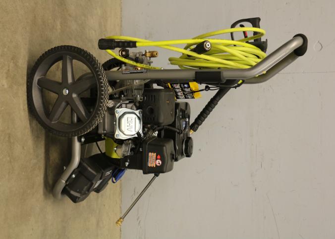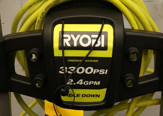 Ryobi gas-powered pressure washer, Model RY80589, featuring a maximum pressure of 3300 PSI and a maximum flow rate of 2.4 GPM. Includes durable wheels, hose, spray wand, nozzle, and ergonomic handle. Designed for outdoor cleaning applications. Pickup only.