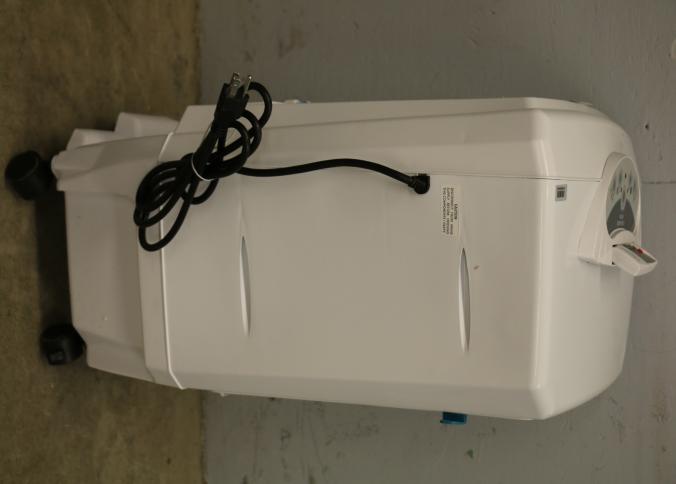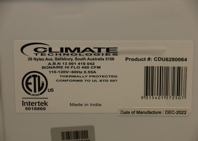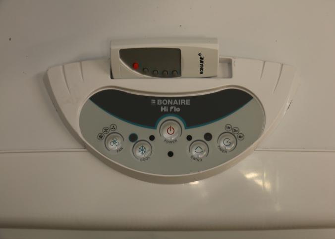 Bonaire Hi Flo 450 CFM Portable Evaporative Air Cooler with Remote, Model CDU6280064. Features include an adjustable control panel, remote control, and a removable filter. Pickup only.