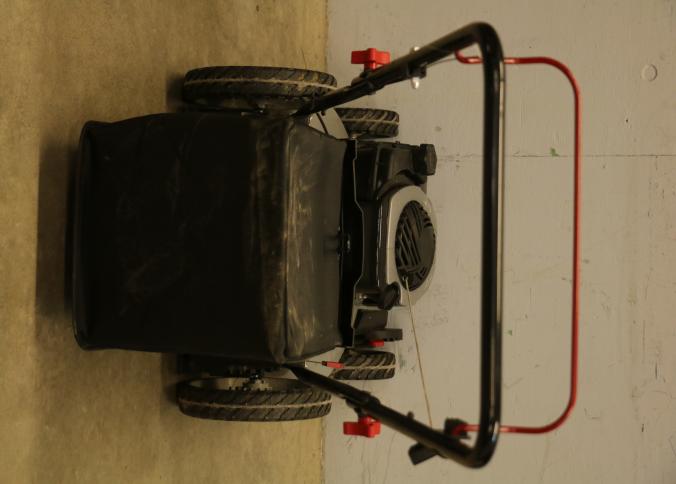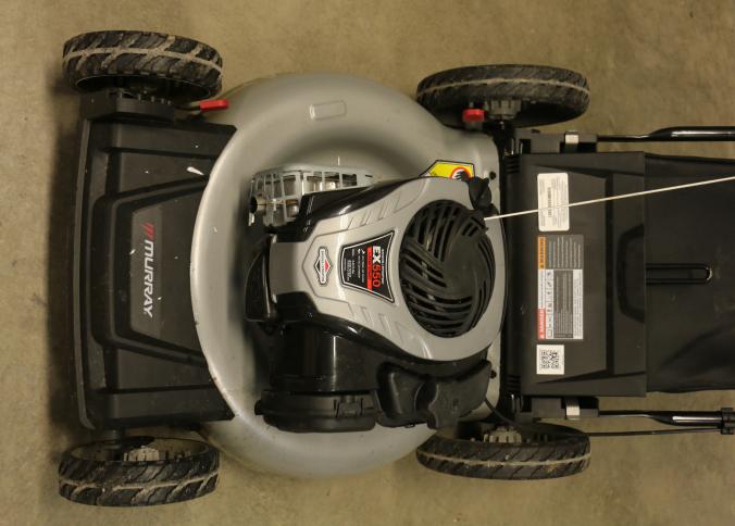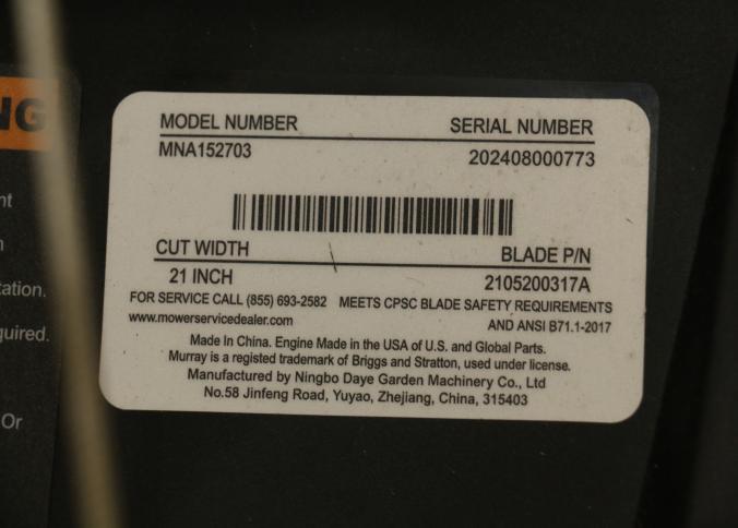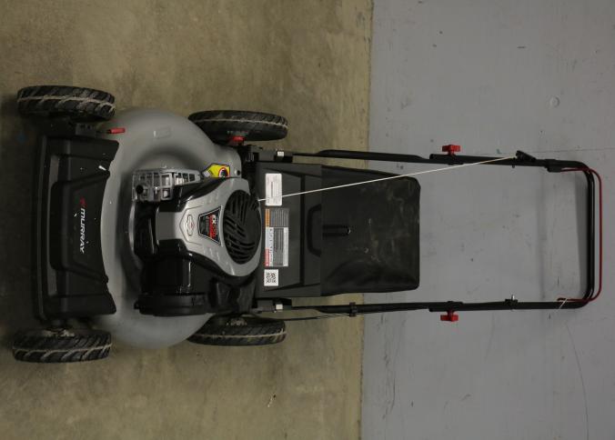 Murray 21-Inch Lawn Mower, Model MNA152703 featuring a Briggs & Stratton EX550 engine with 140cc and 5.50 ft-lbs of gross torque. Includes a 21-inch cut width and a rear discharge bag. Designed with a manual push system, durable wheels, and easy-use handle with control cables. Pickup only.