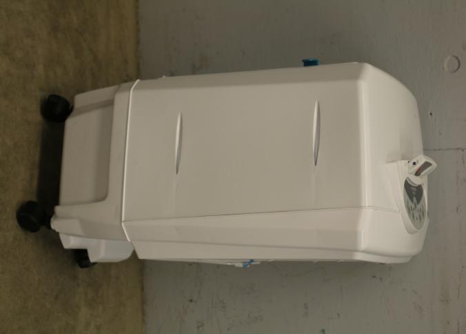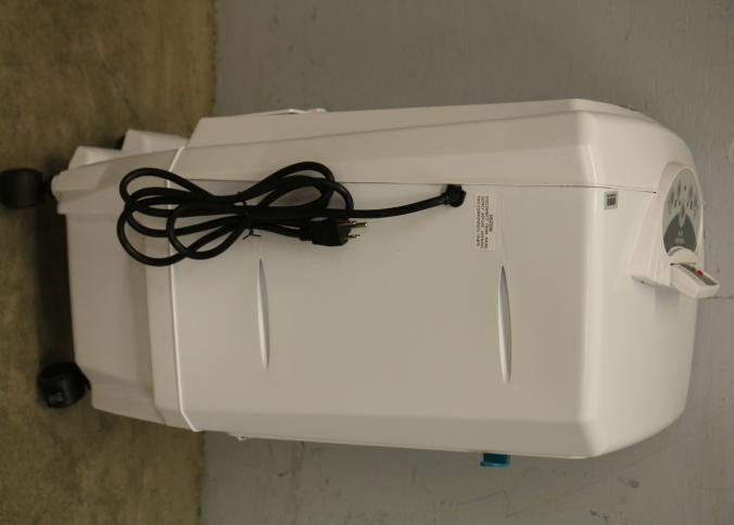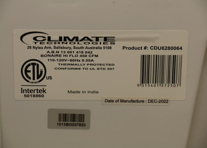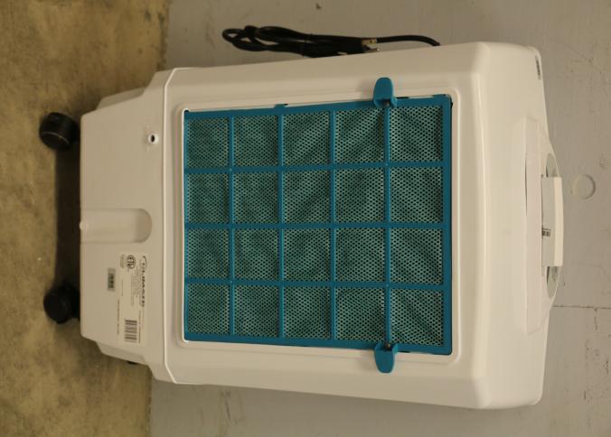Bonaire Hi Flo 450 CFM Portable Evaporative Air Cooler with Remote, Model CDU6280064. Features an adjustable control panel for user preferences, a remote control for convenience, and a removable filter for easy maintenance. Compact design includes built-in casters for mobility and a housing labeled with model details. Pickup only.