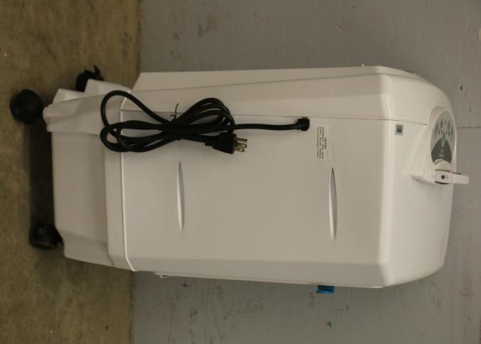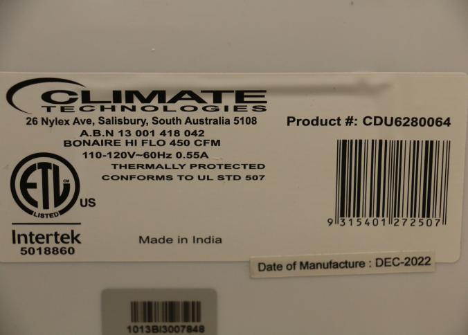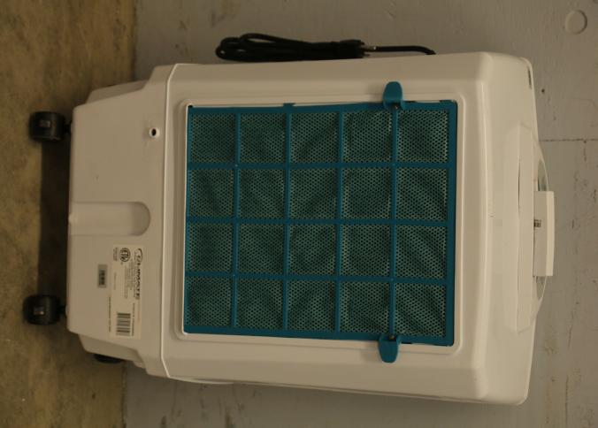 Bonaire Hi Flo 450 CFM Portable Evaporative Air Cooler with Remote, Model CDU6280064. Features an adjustable control panel, remote control, and a removable filter for easy maintenance. Includes rolling casters for portability. Operates on 110-120V, 60Hz, with a power consumption of 0.55A. Pickup only.