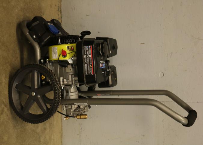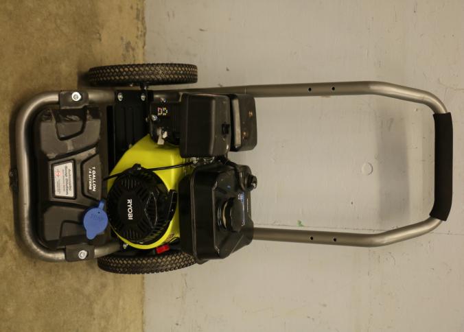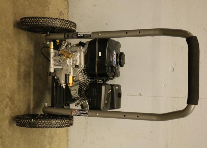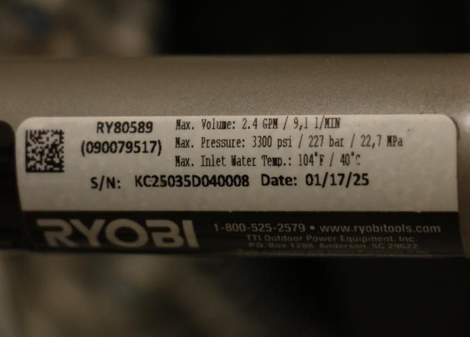 Ryobi gas pressure washer, Model RY80589, featuring a maximum pressure of 3300 PSI and a flow rate of 2.4 GPM. Includes a durable two-wheel frame, hose, and spray gun attachment. Designed for efficient cleaning tasks. Pickup only.