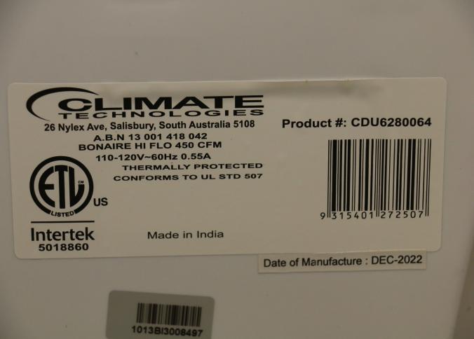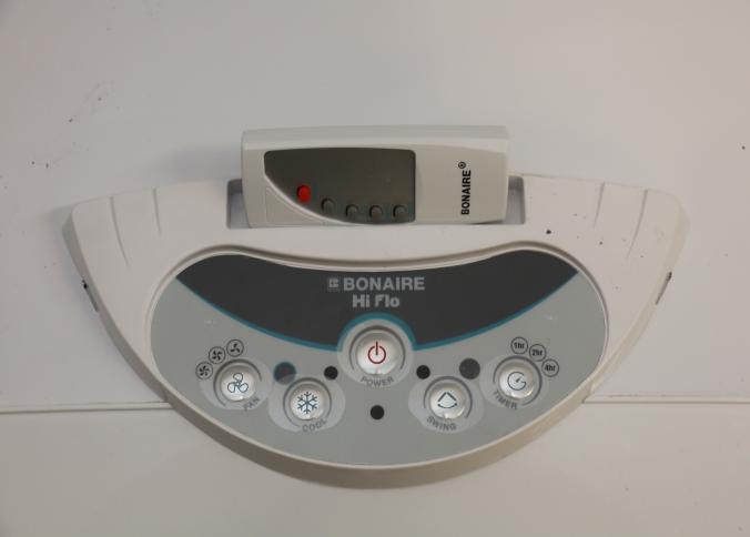 Bonaire Hi Flo 450 CFM Portable Evaporative Air Cooler with Remote, Model CDU6280064. Features an adjustable control panel, remote control, and a removable filter. Includes wheels for portability and operates on 110-120V, 60Hz, 0.55A. Pickup only.