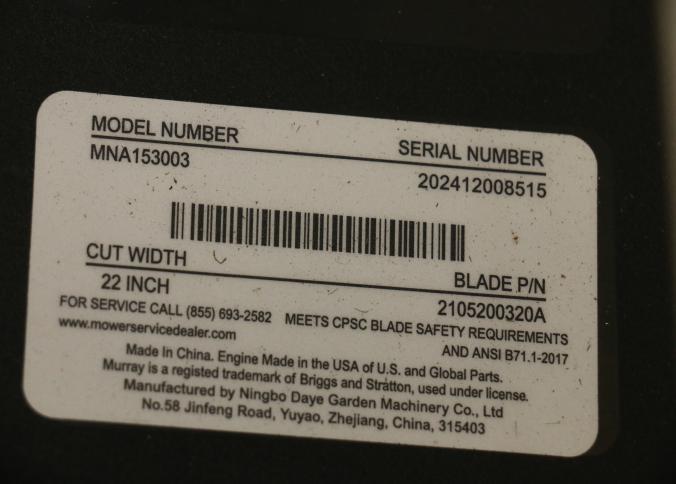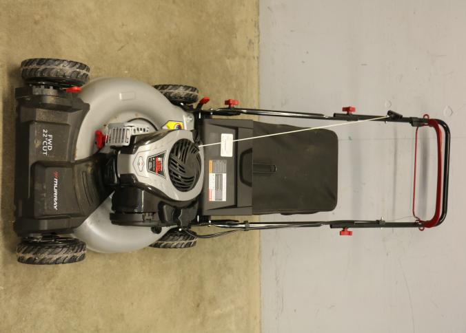 Murray 22-Inch Lawn Mower, Model MNA153003, with Briggs & Stratton Engine. Features a 22-inch cutting width, 140cc E550 Prime Briggs & Stratton engine, and a rear grass collection bag. Includes forward-wheel drive and manual height adjustments. Hardware not included. Pickup only.
