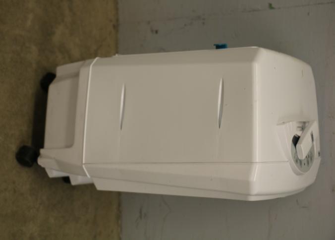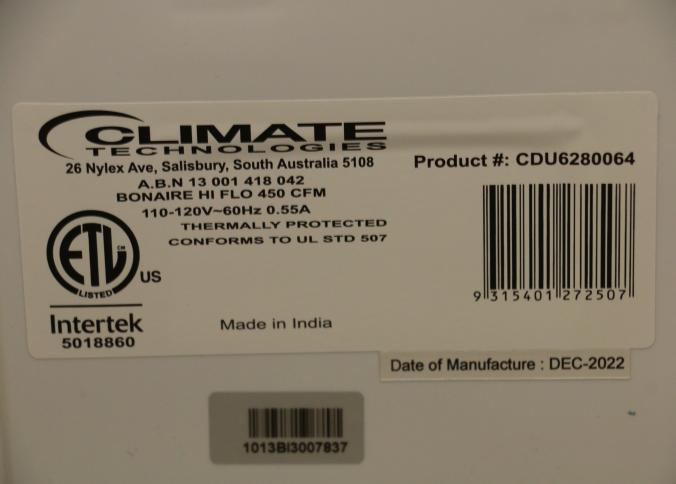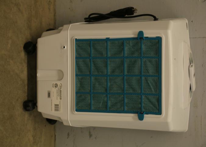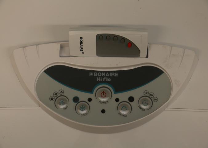 Bonaire Hi Flo 450 CFM Portable Evaporative Air Cooler with Remote, Model CDU6280064. Features an adjustable control panel, remote control, and a removable filter. Designed for efficient cooling and mobility with built-in caster wheels and a compact design. Thermally protected and conforms to UL STD 507. Pickup only.