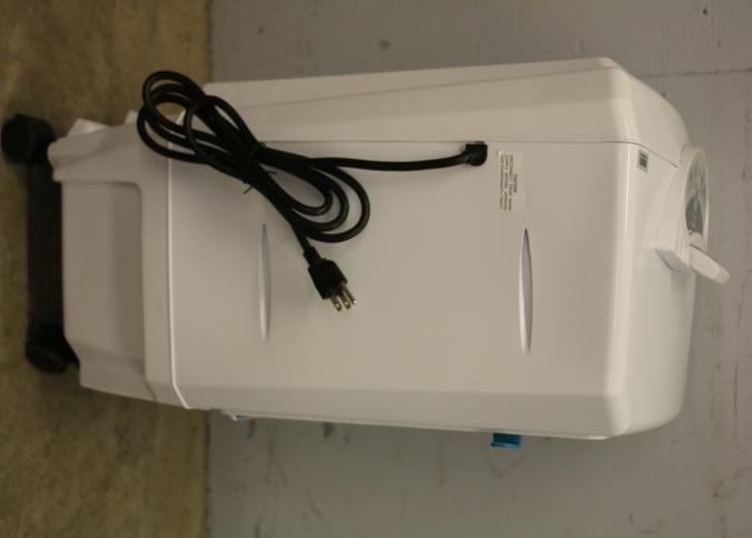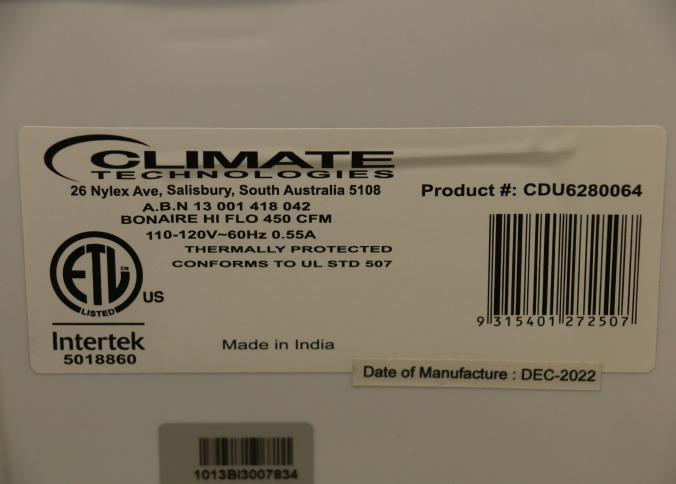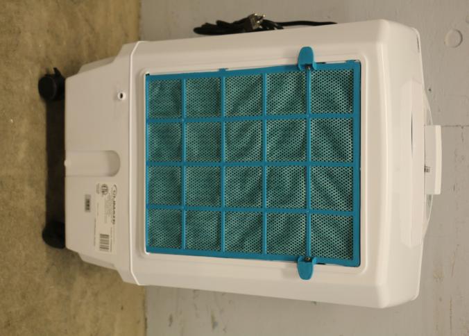 Bonaire Hi Flo 450 CFM Portable Evaporative Air Cooler with Remote, Model CDU6280064. Features an adjustable control panel, remote control for convenience, and a removable filter for easy maintenance. The unit is designed to be portable with caster wheels. Power requirements are 110-120V~60Hz 0.55A. Pickup only.