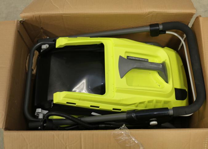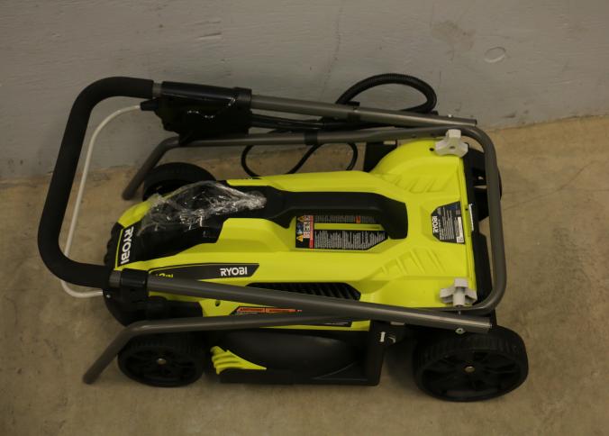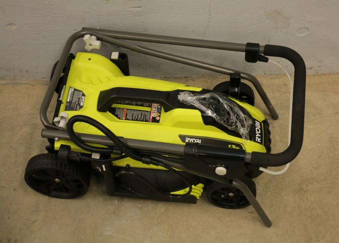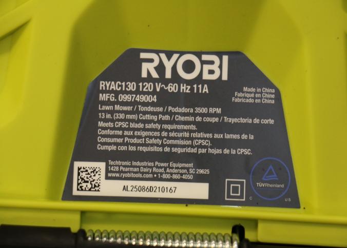 Ryobi 13-Inch Corded Electric Lawn Mower, Model RYAC130, 11 Amp. Features a 13-inch cutting path, mulching and rear bagging capabilities, lightweight compact design, and single-point height adjustment. Pickup only.