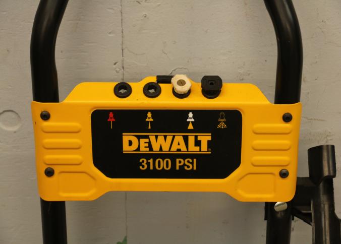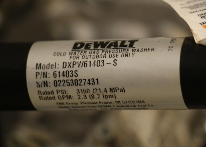 DeWalt 3100 PSI Gas Pressure Washer Model DXPW61403-S. Features a cold water gas pressure system with a rated 2.3 GPM flow. Includes durable wheels and built-in storage for accessories. Unit does not have compression and does not start. Pickup only.