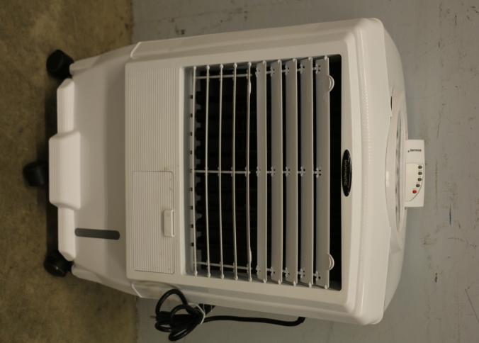 Bonaire Hi Flo 450 CFM Portable Evaporative Air Cooler, Model CDU6280064. Features an adjustable control panel, a remote control, and a removable rear air filter for ease of maintenance. Includes caster wheels for mobility and a convenient cord storage option. Pickup only.