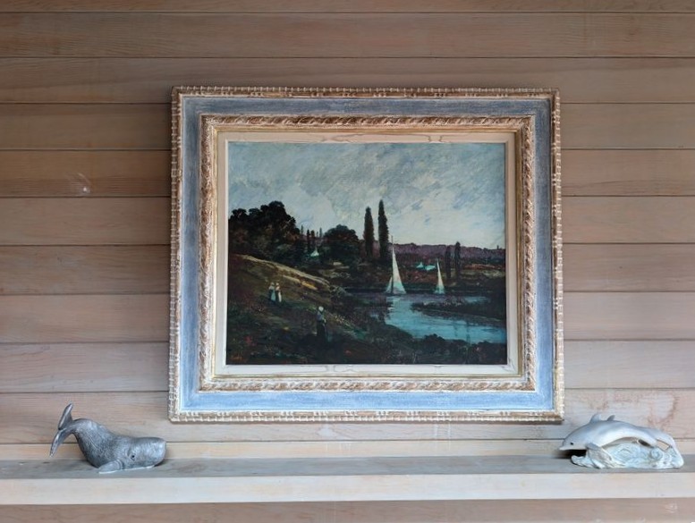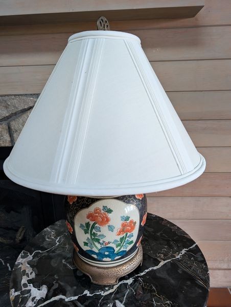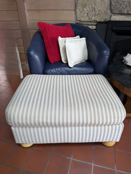 Furniture, Art, Décor, featuring Baker Tables. Blue leather saucer chair with attach cushion, 32"Wx30"Dx32"H; striped upholstered ottoman, 32"Wx22"Dx17"H; Baker coffee table, 3'diameter x17"H & side drum table, 22"diameter x 25"H; framed print of hillside/sailboat, 42"Wx35"H sign Purdy; Asian-style lamp, 25"H; beach-themed décor.