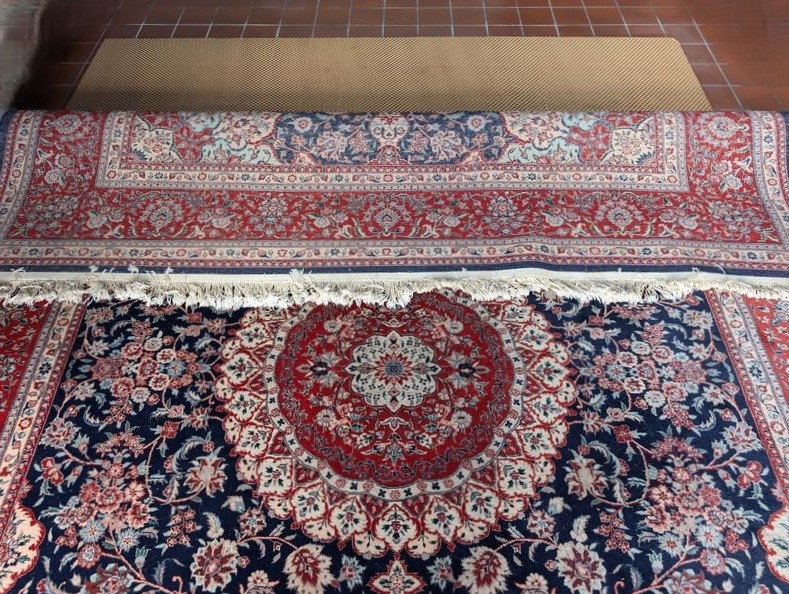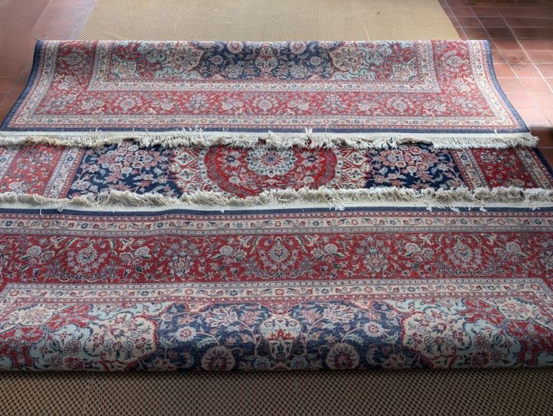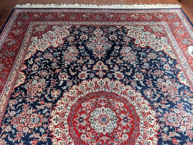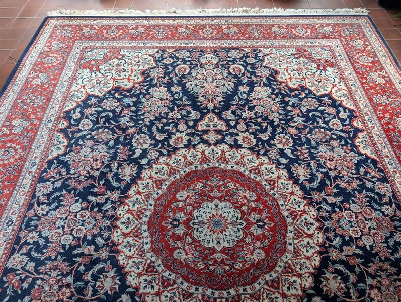 Area Rug. Approx 9'x12' fringed area rug. See photos for pattern and cond. No stains noticed (see back photos).