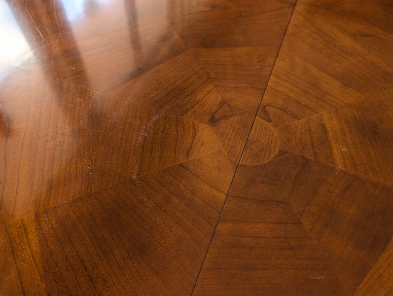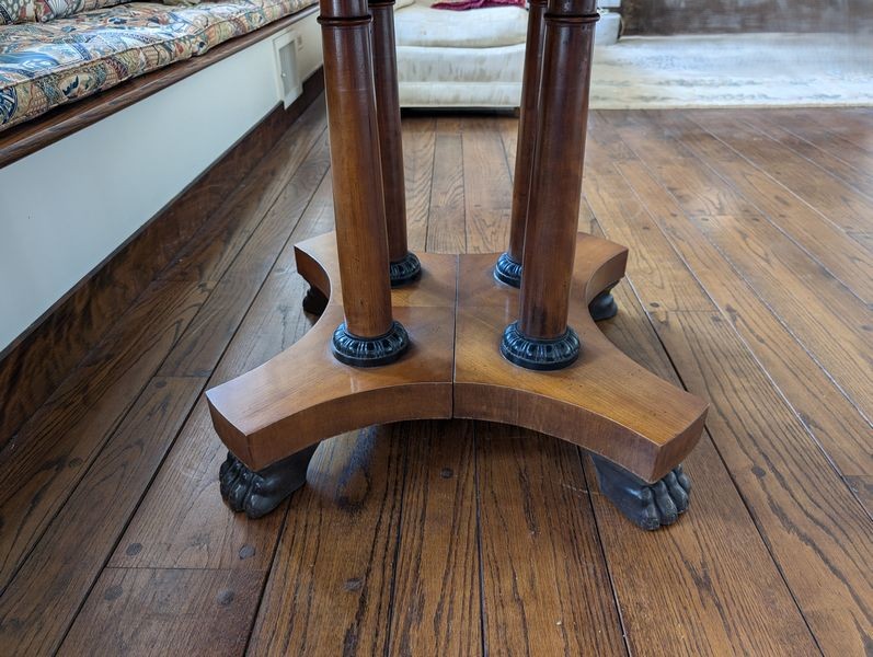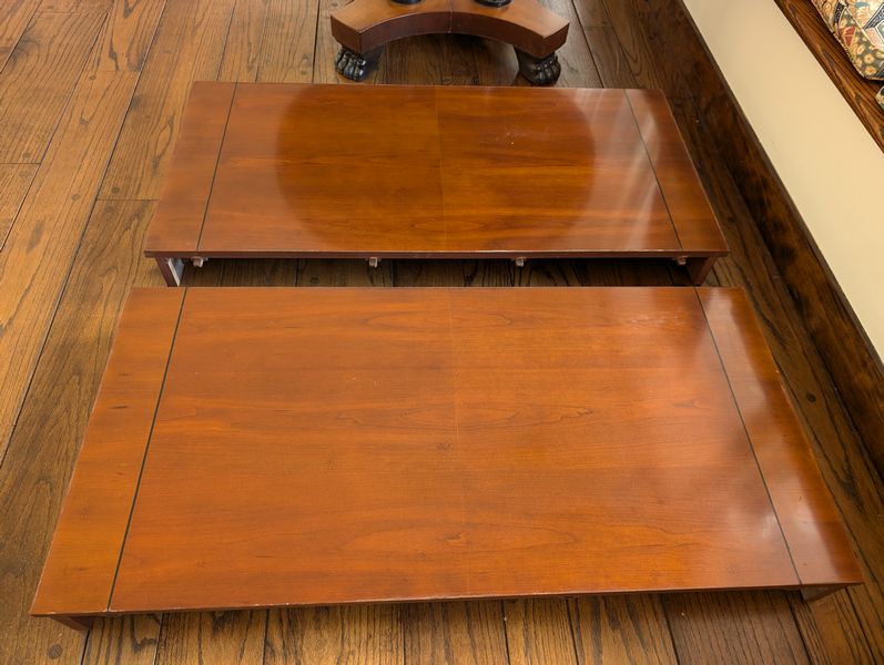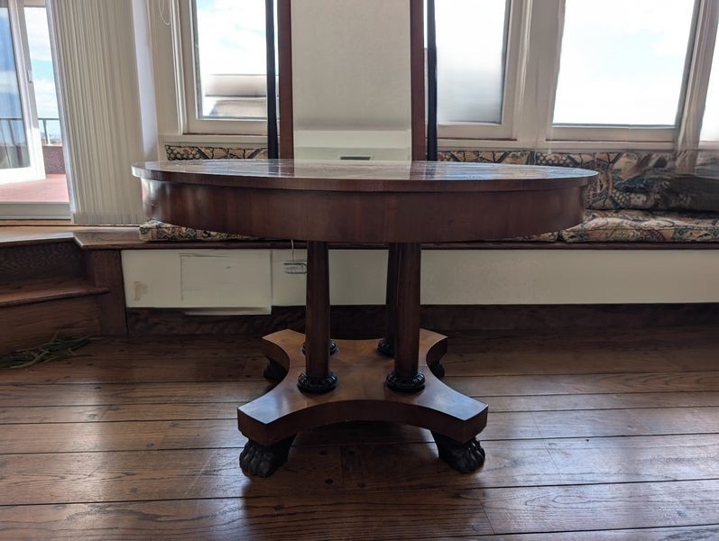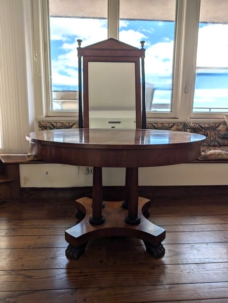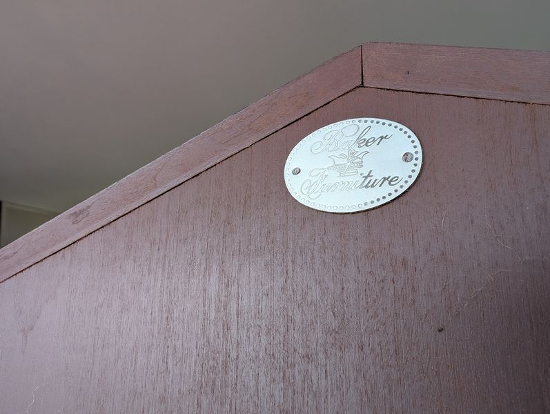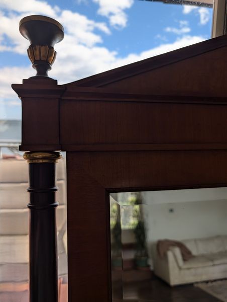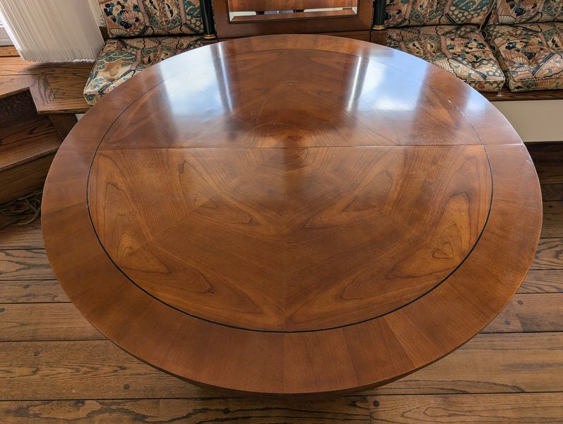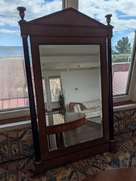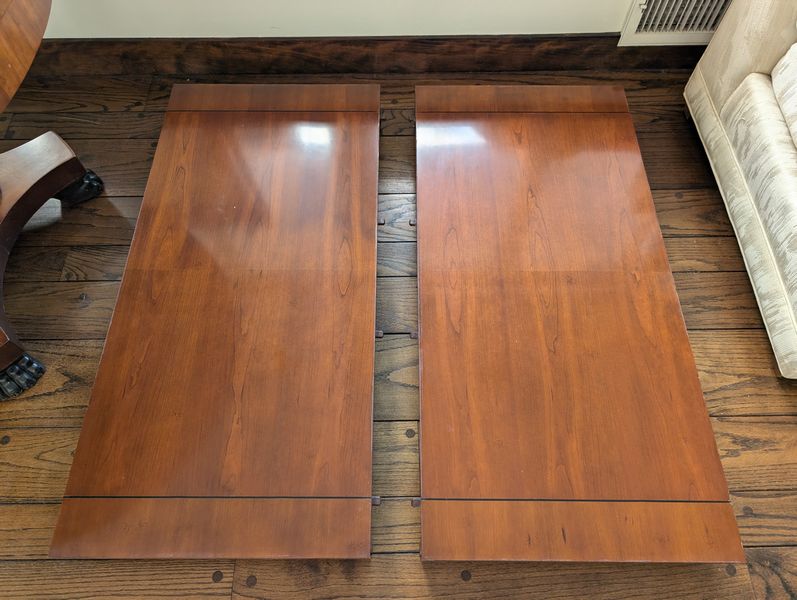Baker Dining Table, Wall Mirror. Round Baker pedestal table, 46"diameter x29"H with two 2' ea. table inserts; matching decorative Baker wall mirror, 32"Wx3"Dx51"H. Items seen in background not incl.