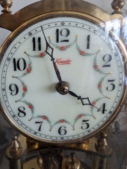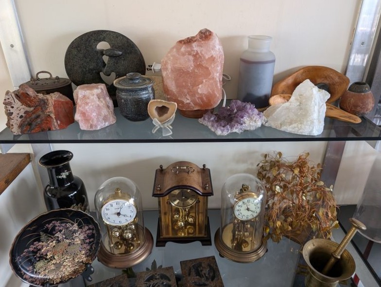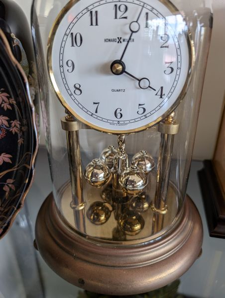 Clocks, Collectibles. Three mantle clocks (see photos for names), ea. approx. 9"H; Asian-style vase, 11"H; brass mortar & pestle; Norman Rockwell collector's plate with auth, 8.5"diameter; other collectibles as seen on shelves.