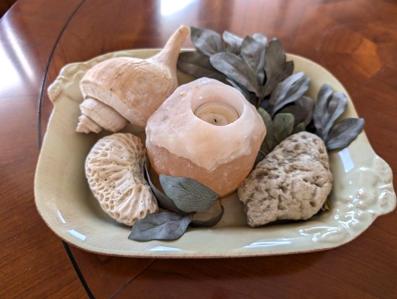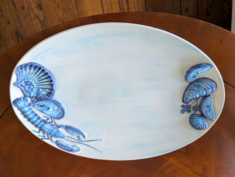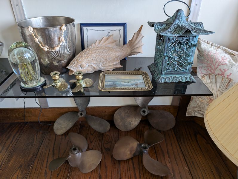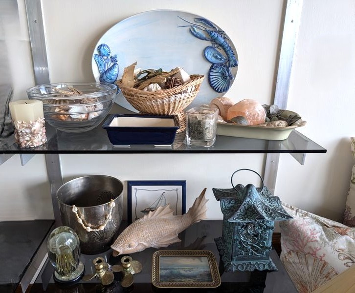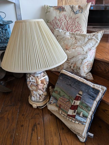 Beach-Themed Décor. Blue lobster platter made in Italy, 20"Lx14"W; shell-filled table lamp with shade, 29"H; brass propellers, largest 15"diameter; throw pillows; other related items as seen in photos.