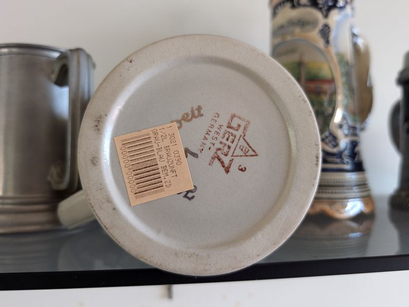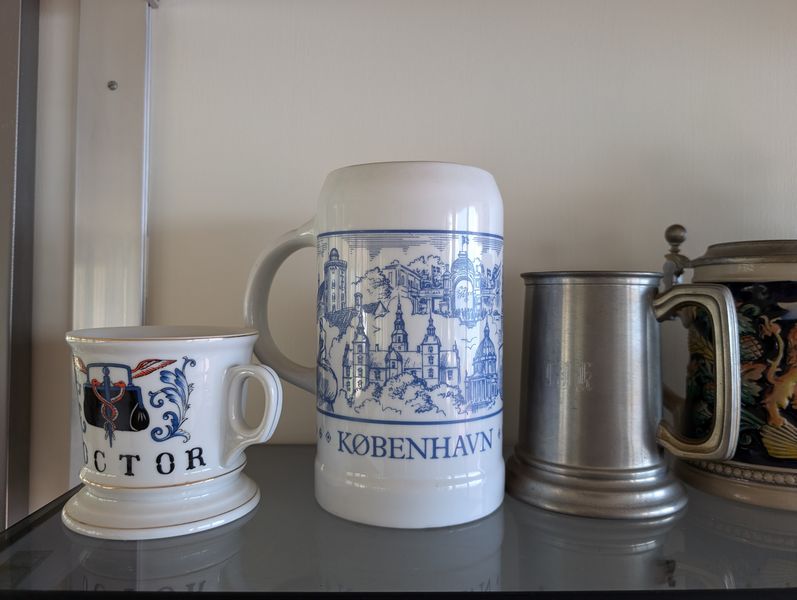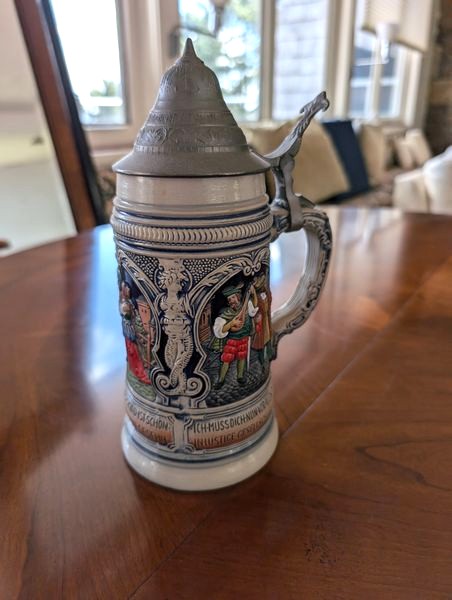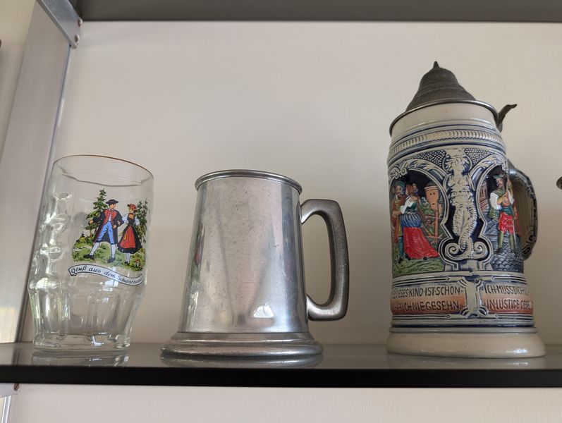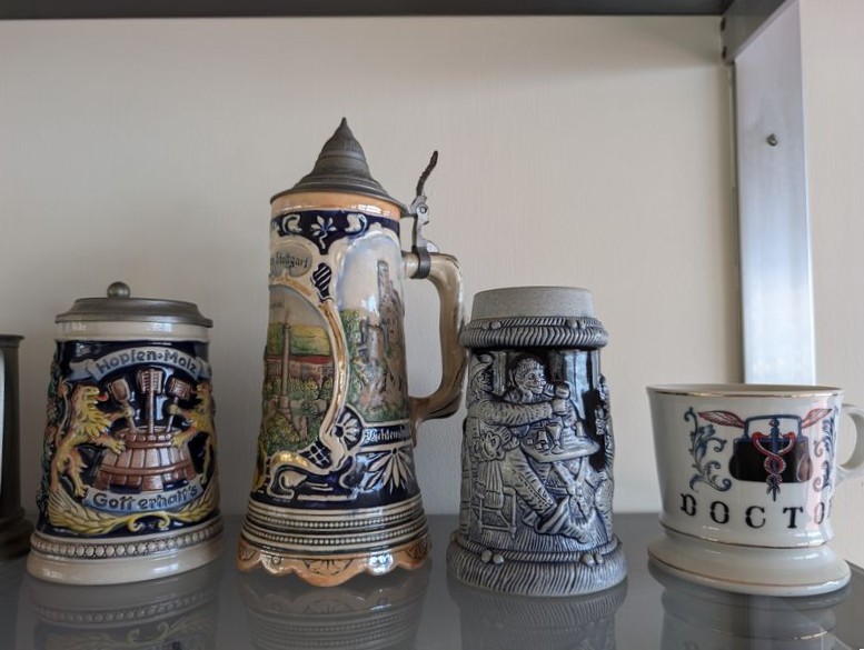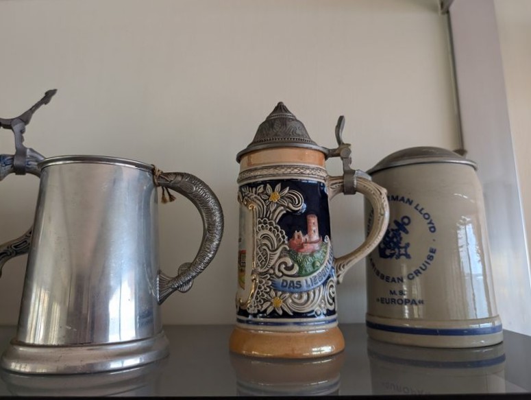 Beer Steins, Authentic Germany. Thirteen mugs and steins, some German-see photos. Tallest, 10"H.