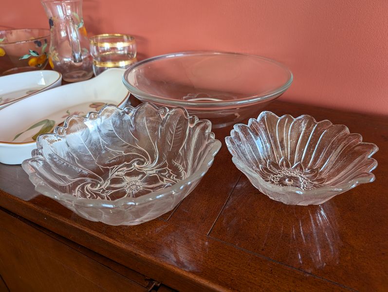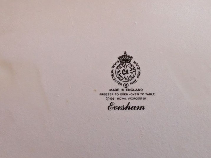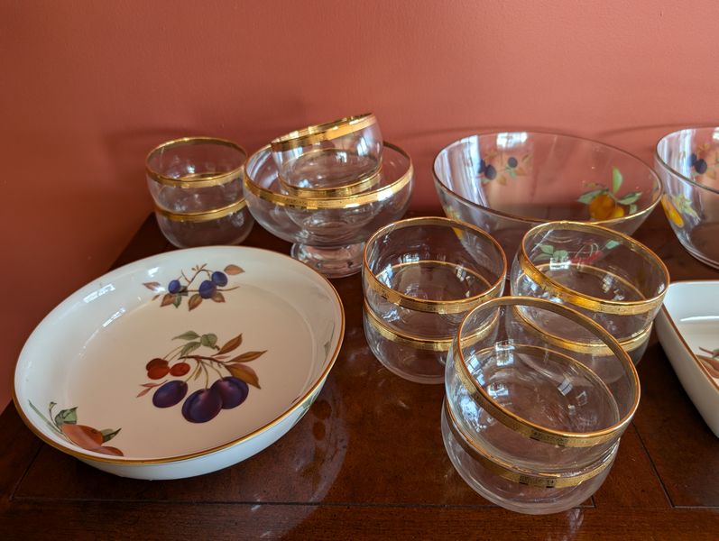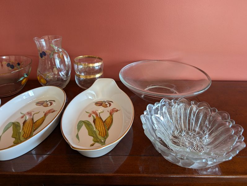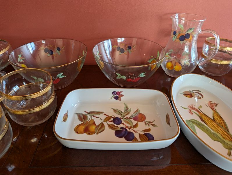 Entertaining, featuring Evesham. Evesham Royal Worcester entertaining pieces, incl: handled platter, 14"L; oval platter, 12.5"L; two bowls, ea. 9"diameter; round platter, 10"diameter; pitcher, 8"H; rectangle platter, 10.5"Lx7"W; coordinating gold-trimmed salad bowl set; three clear glass bowls. Matches dish set in lot #13.