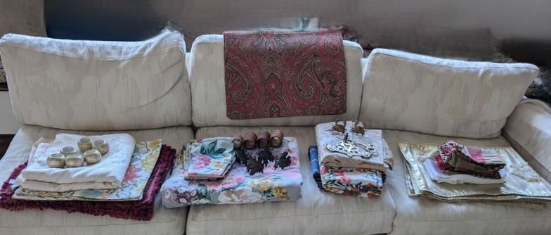 Farberware Gold Flatware Set, Table Linens. Farberware complete 5-piece, service of 12 flatware set with hostess pieces; assort tables linens, incl tablecloths & napkins; assort napkin rings-see photos for quantity & details. Items seen in background not incl.