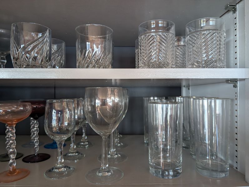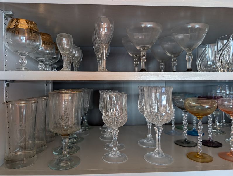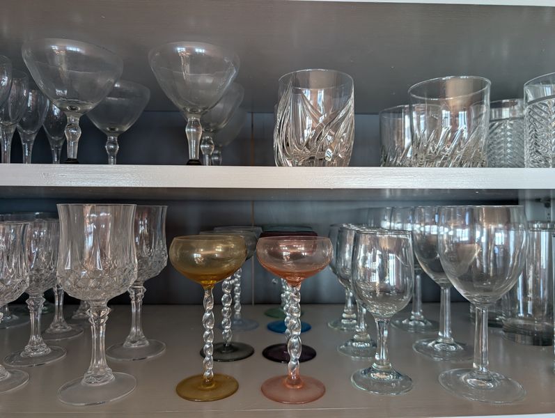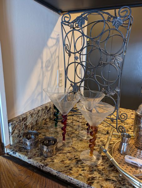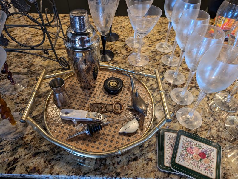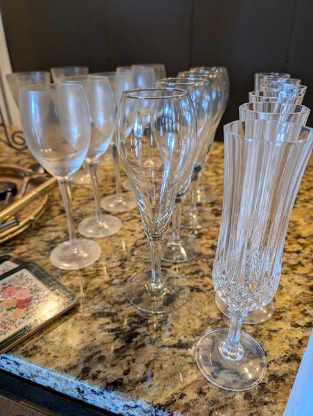 Bar Glasses, Wine Rack, Bartenders' Tools. Several crystal and glass stemware sets; wine rack, 16"Wx8"Dx20"H; Sharper Image bottle opener; Lenon highball crystal glasses; water & wine etched with family name; other related items as seen in photos.